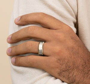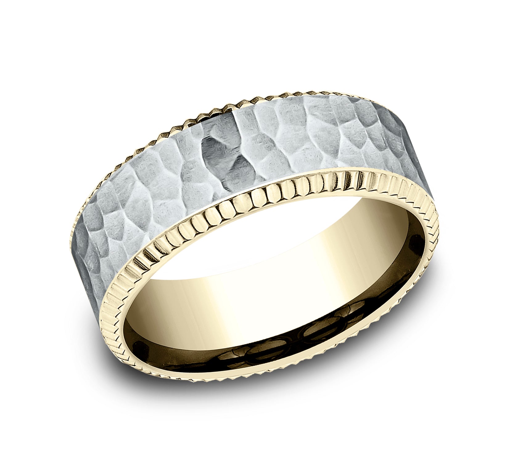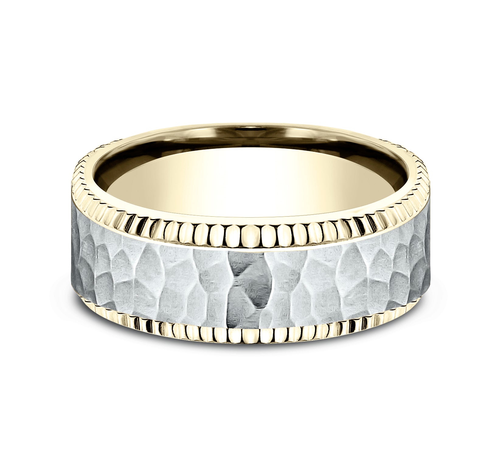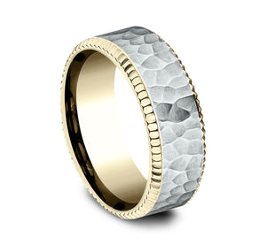 8mm, Comfort fit 14K Yellow and White Gold Hammered center, fluted bevel edges