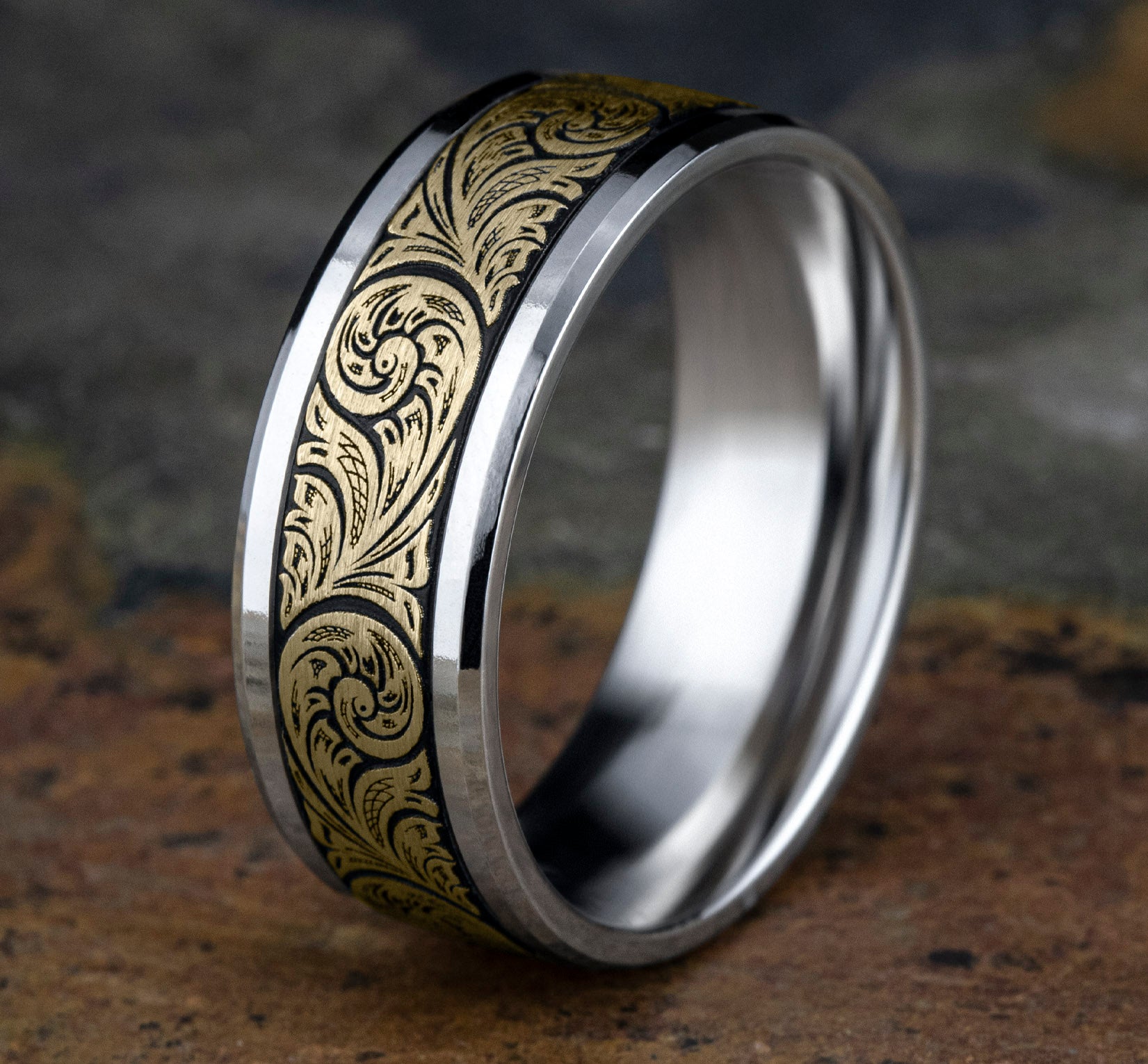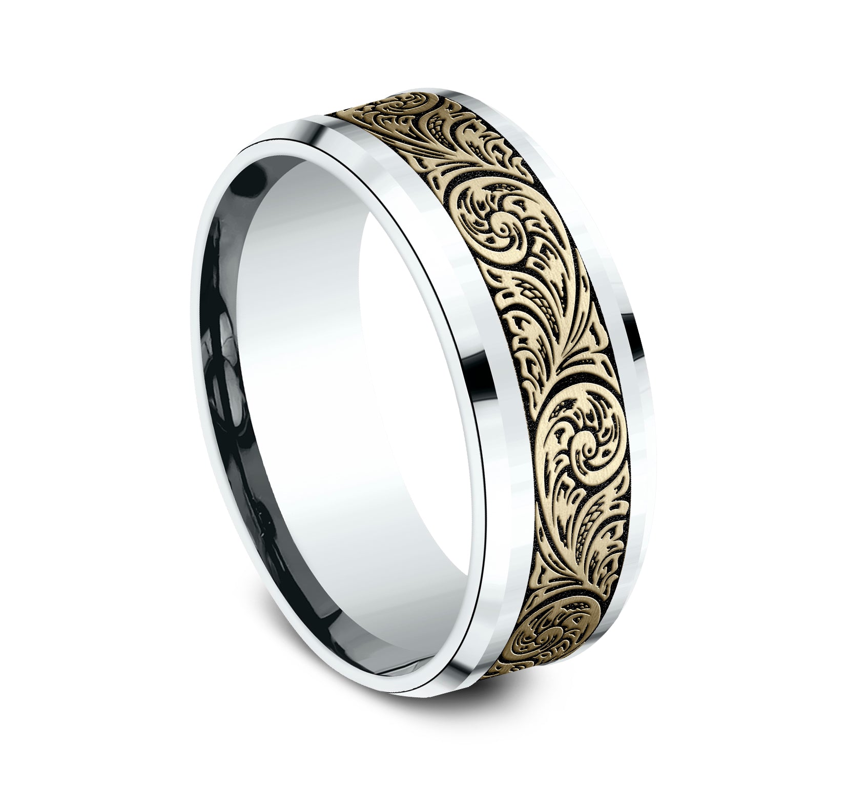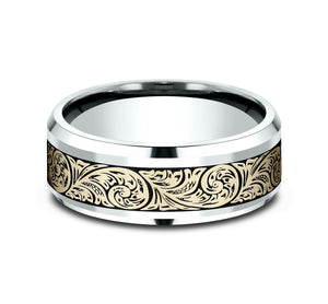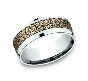 8mm, Comfort fit 14K White and Yellow Gold Vintage floral script patterned center with wear resistant black detailing, polished bevel edges