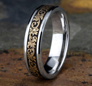 6mm, Comfort fit 14K White and Yellow Gold Vintage script pattern with wear resistant black detailing, polished bevel edges