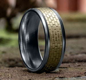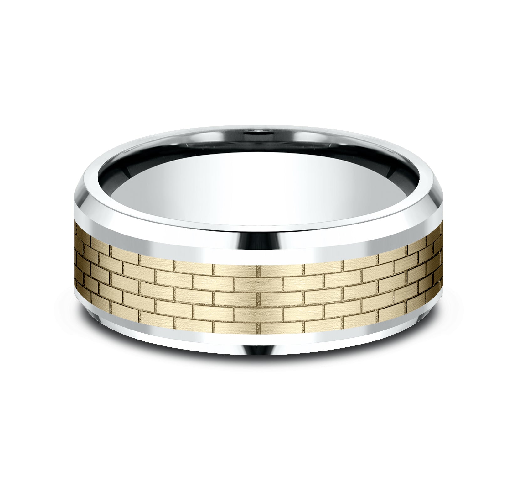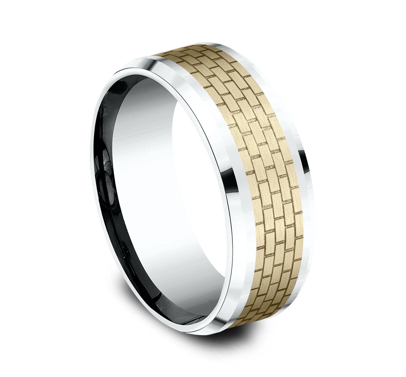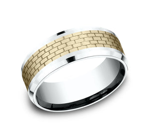 8mm, Comfort fit 14K White and Yellow Gold Brick wall patterned center, polished bevel edges