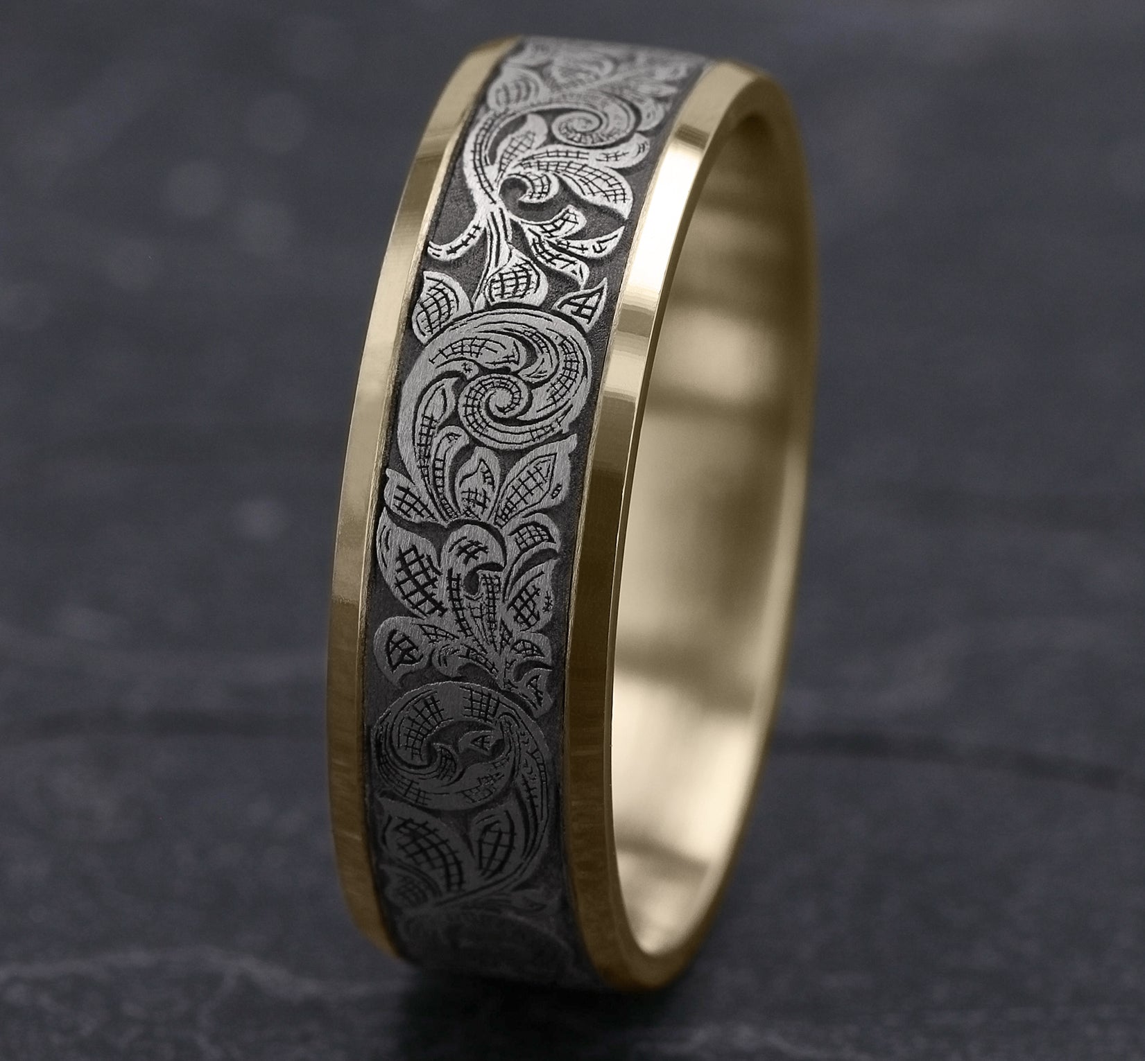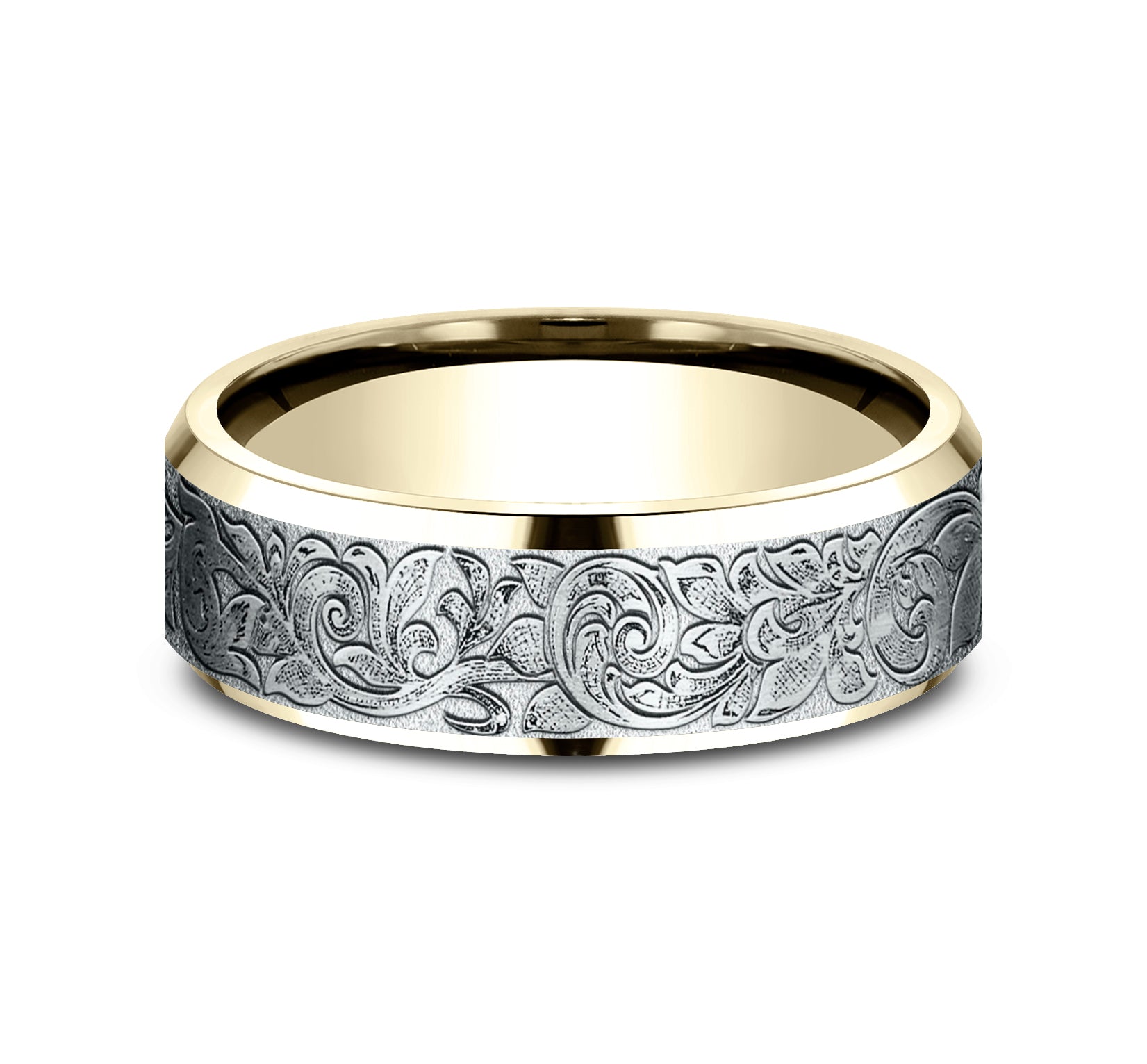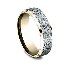 7mm, Lightweight comfort fit 14K Yellow and White Gold London script patterned center, polished bevel edges
