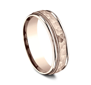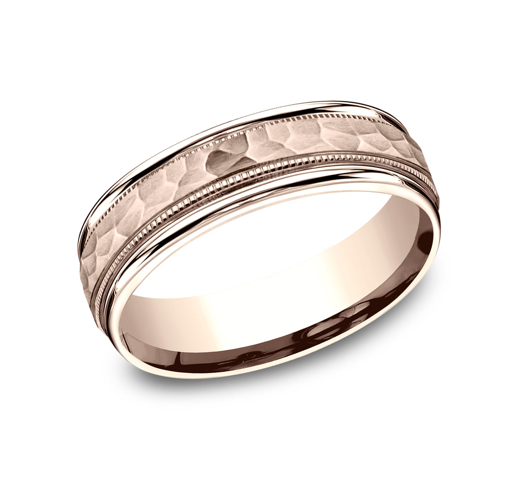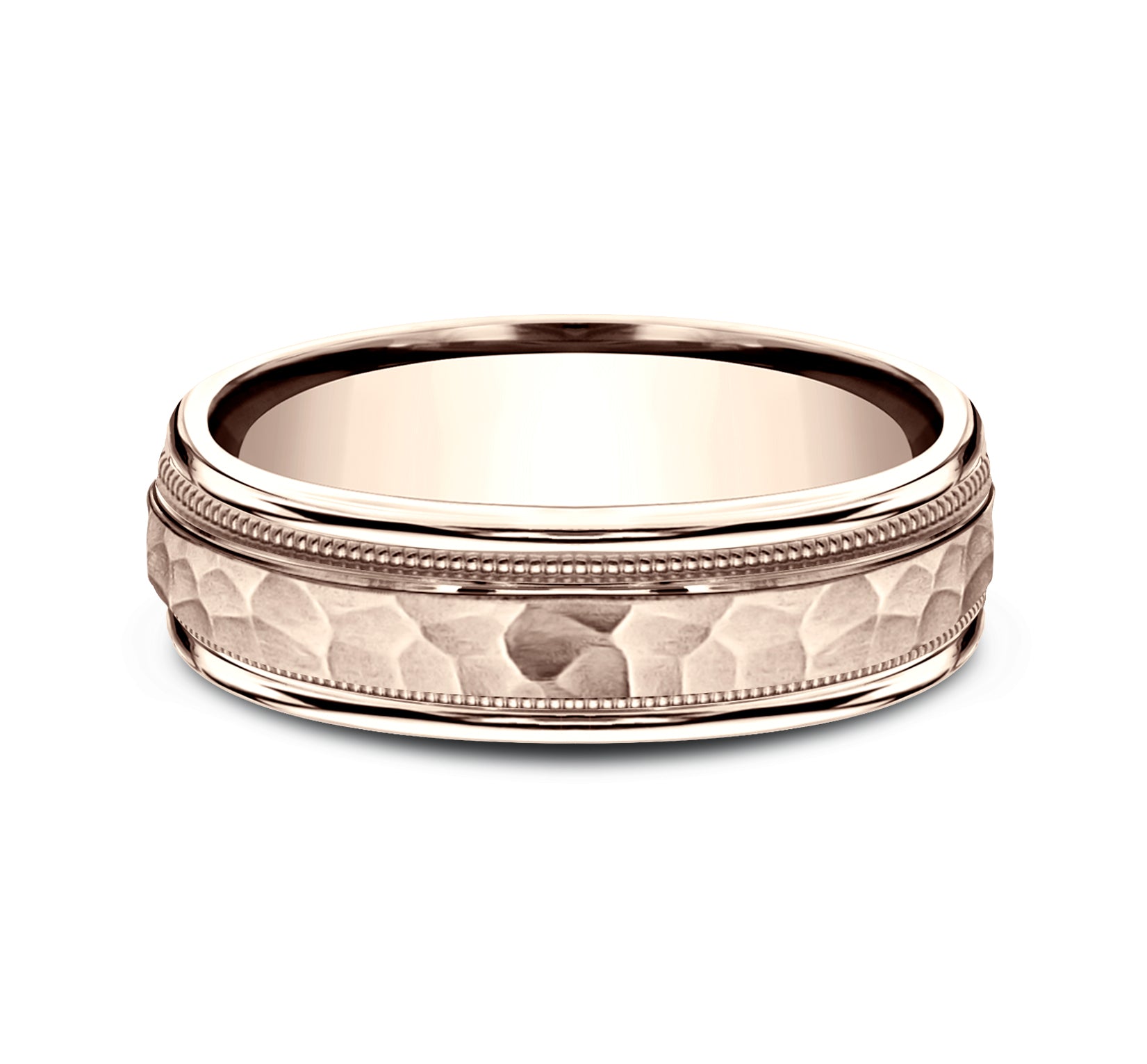 6.5mm, Lightweight comfort fit 14K Rose Gold Hammered center, milgrain detailing, polished round edges