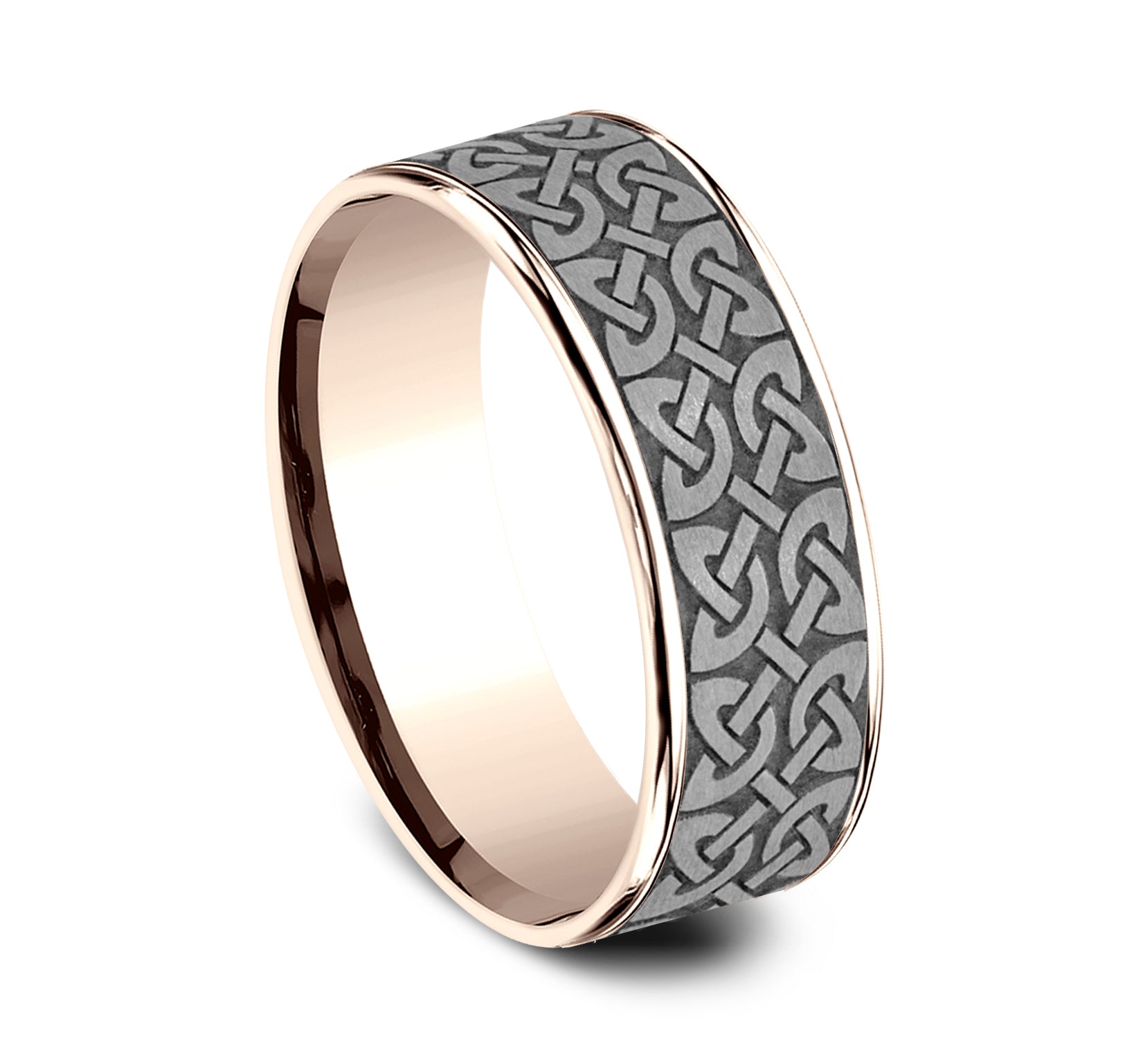 7.5mm, Comfort fit 14K Rose Gold and Grey Tantalum Celtic knot designed center, thin polished edges