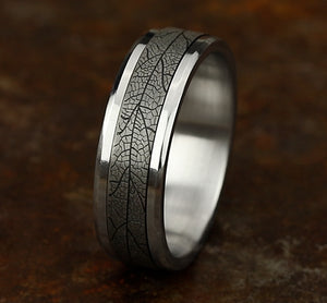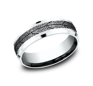 7mm, Comfort fit 14K White Gold and Grey Tantalum Leaf patterned center, bevel edges