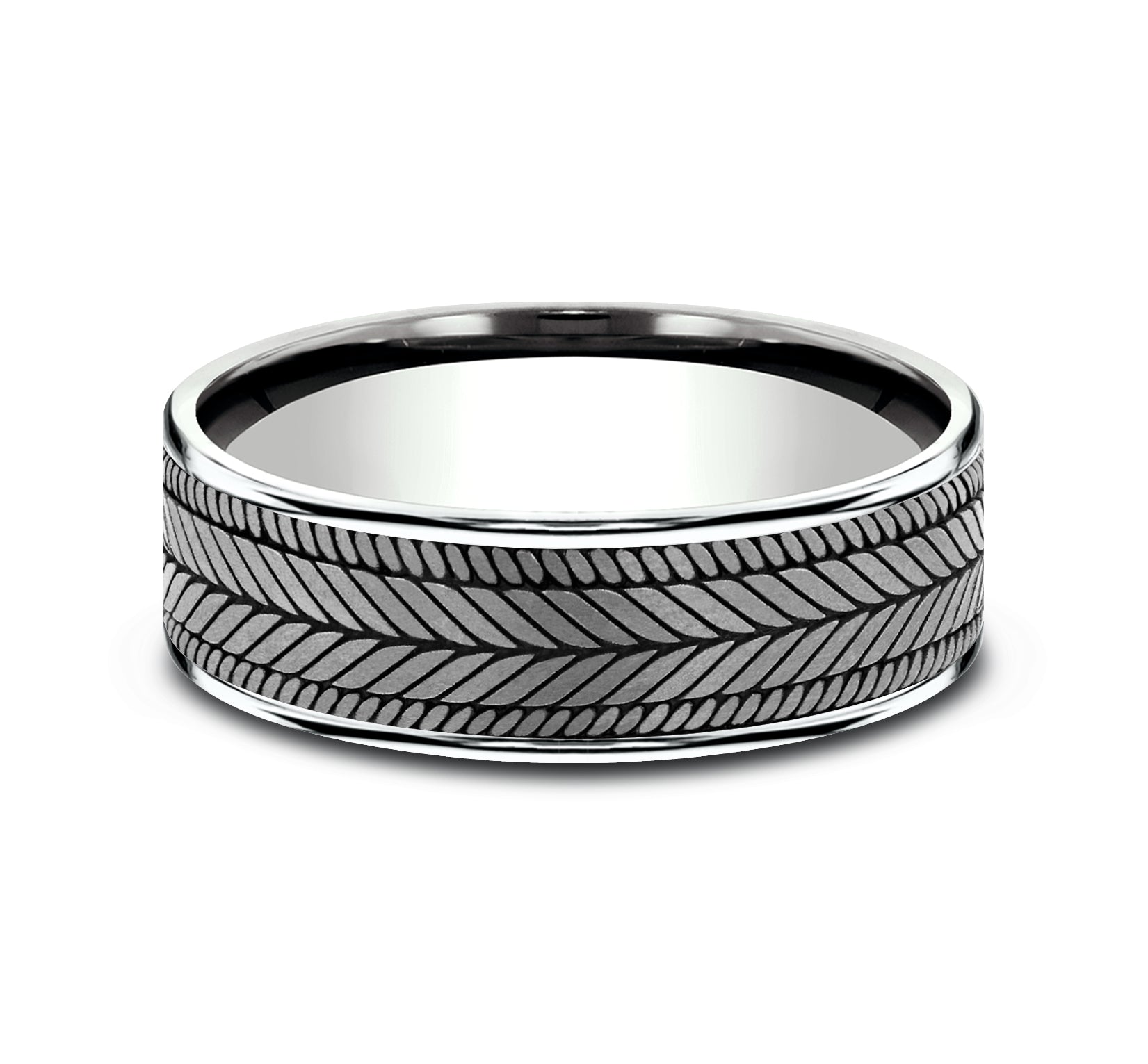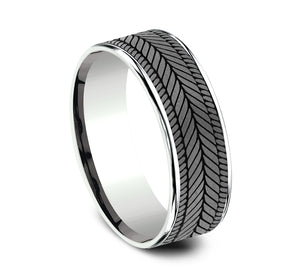 7.5mm, Comfort fit 14K White Gold and Grey Tantalum Chevron weave pattern, thin edges