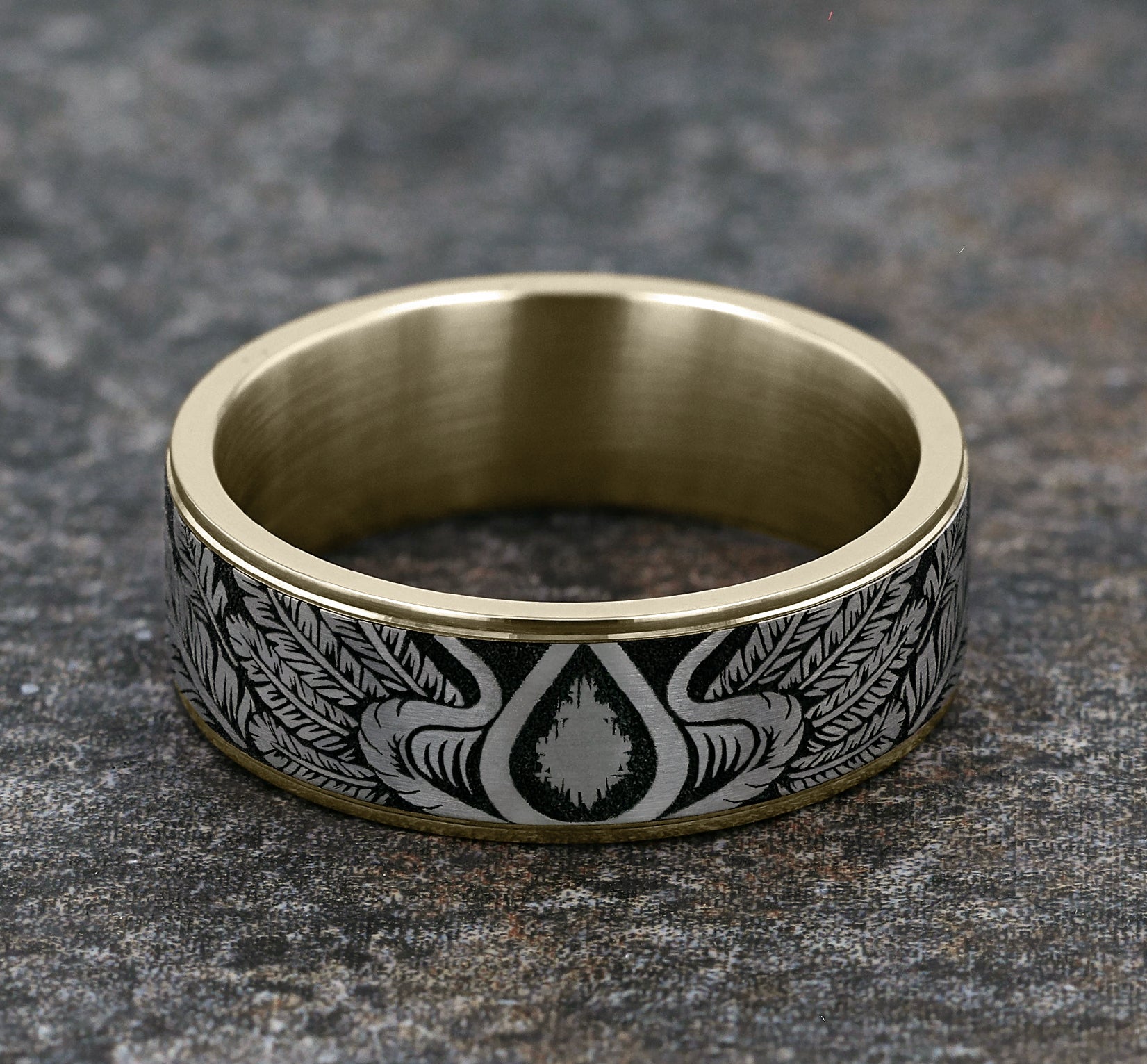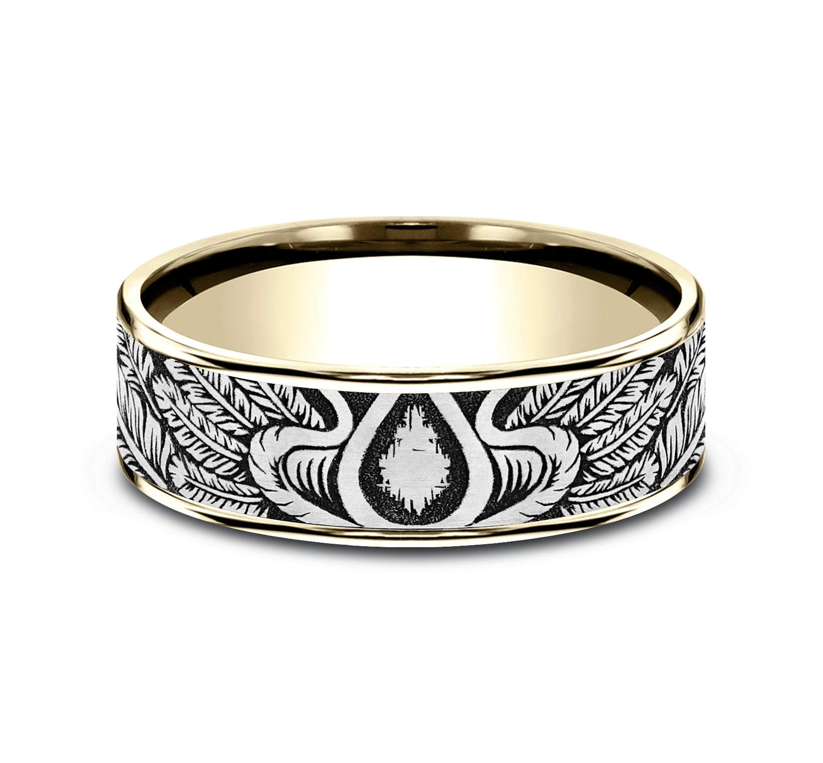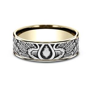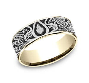 7.5mm, Comfort fit 14K Yellow Gold and Grey/Black Titanium Feather pattern, thin edges