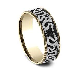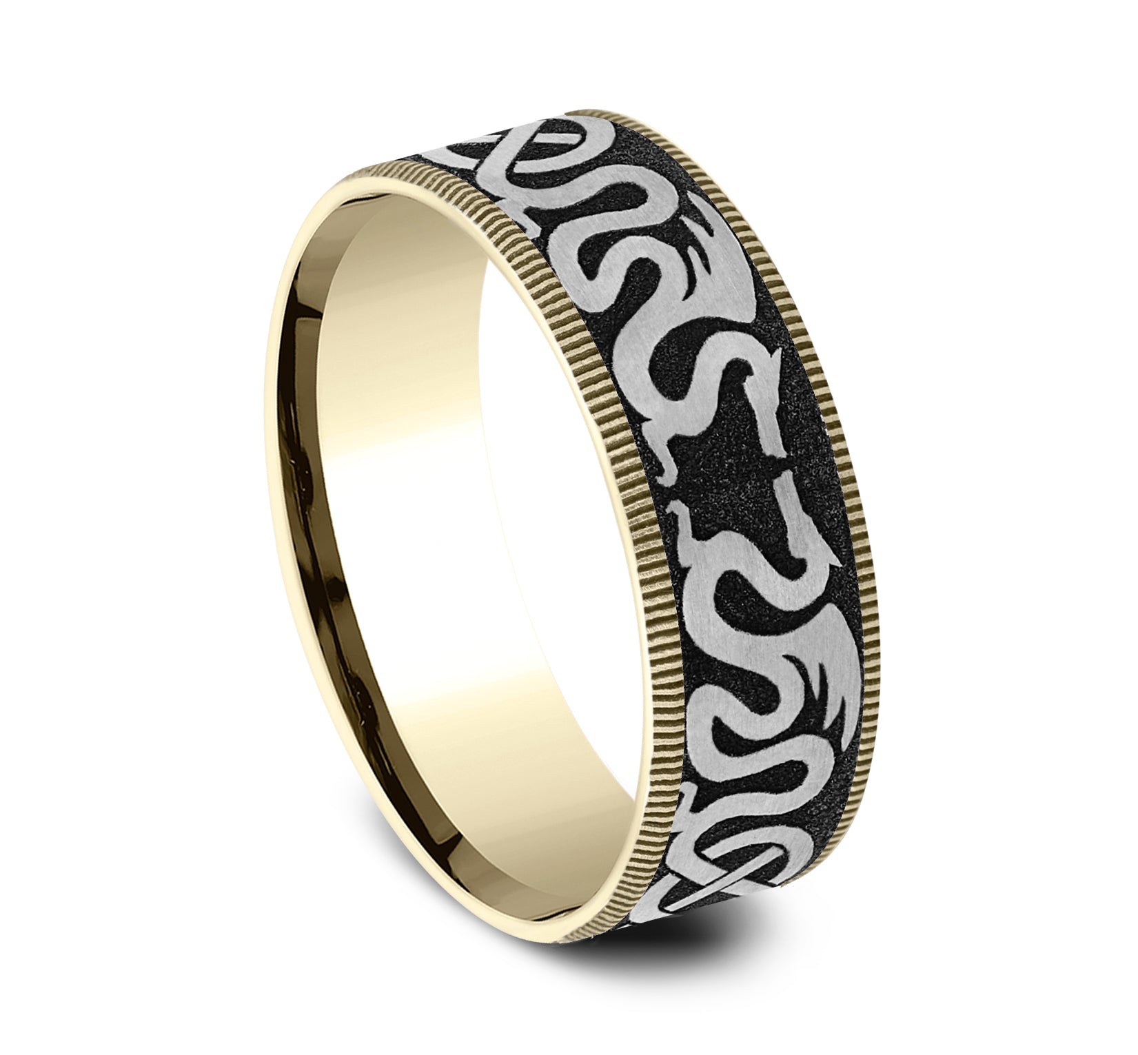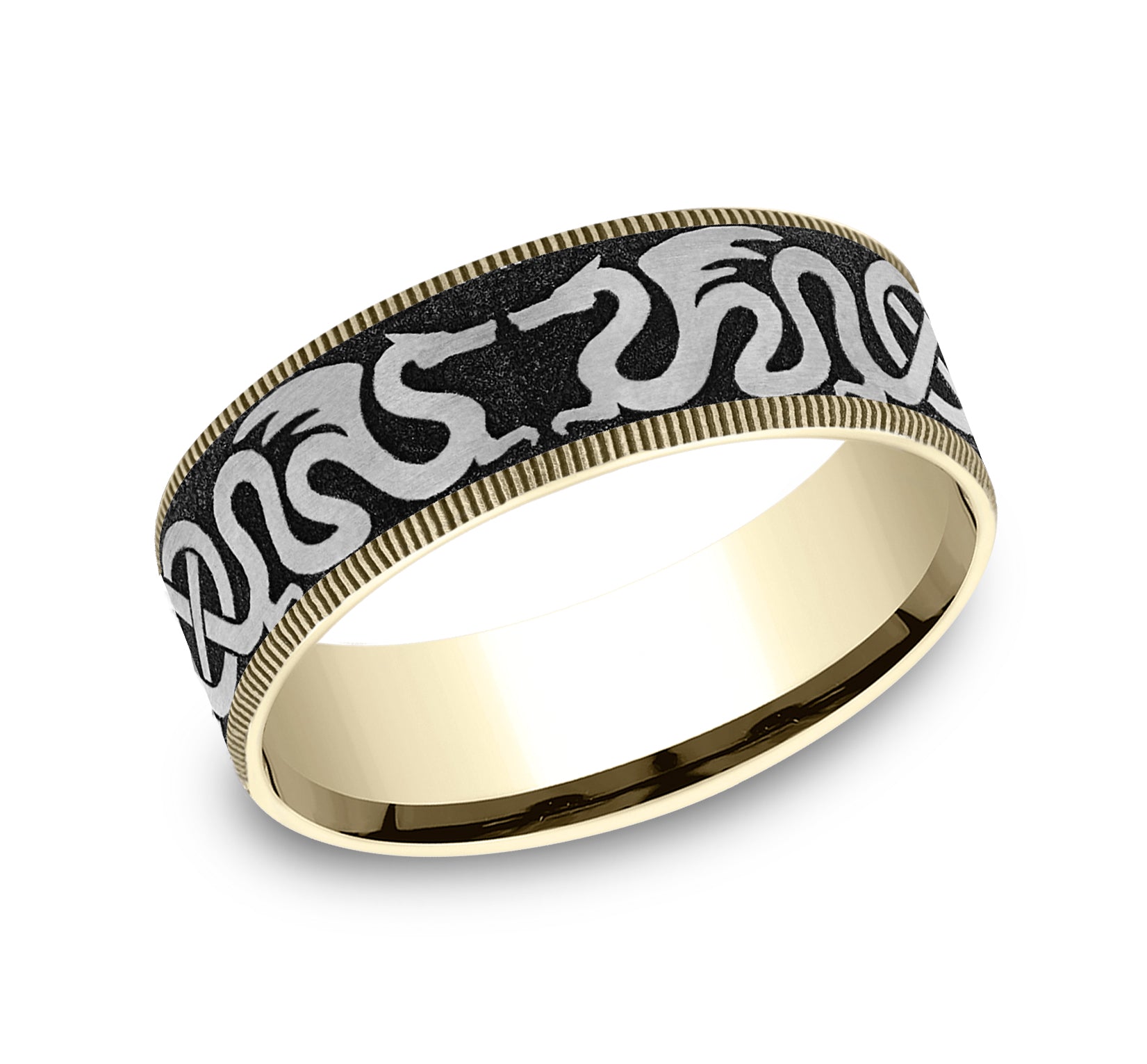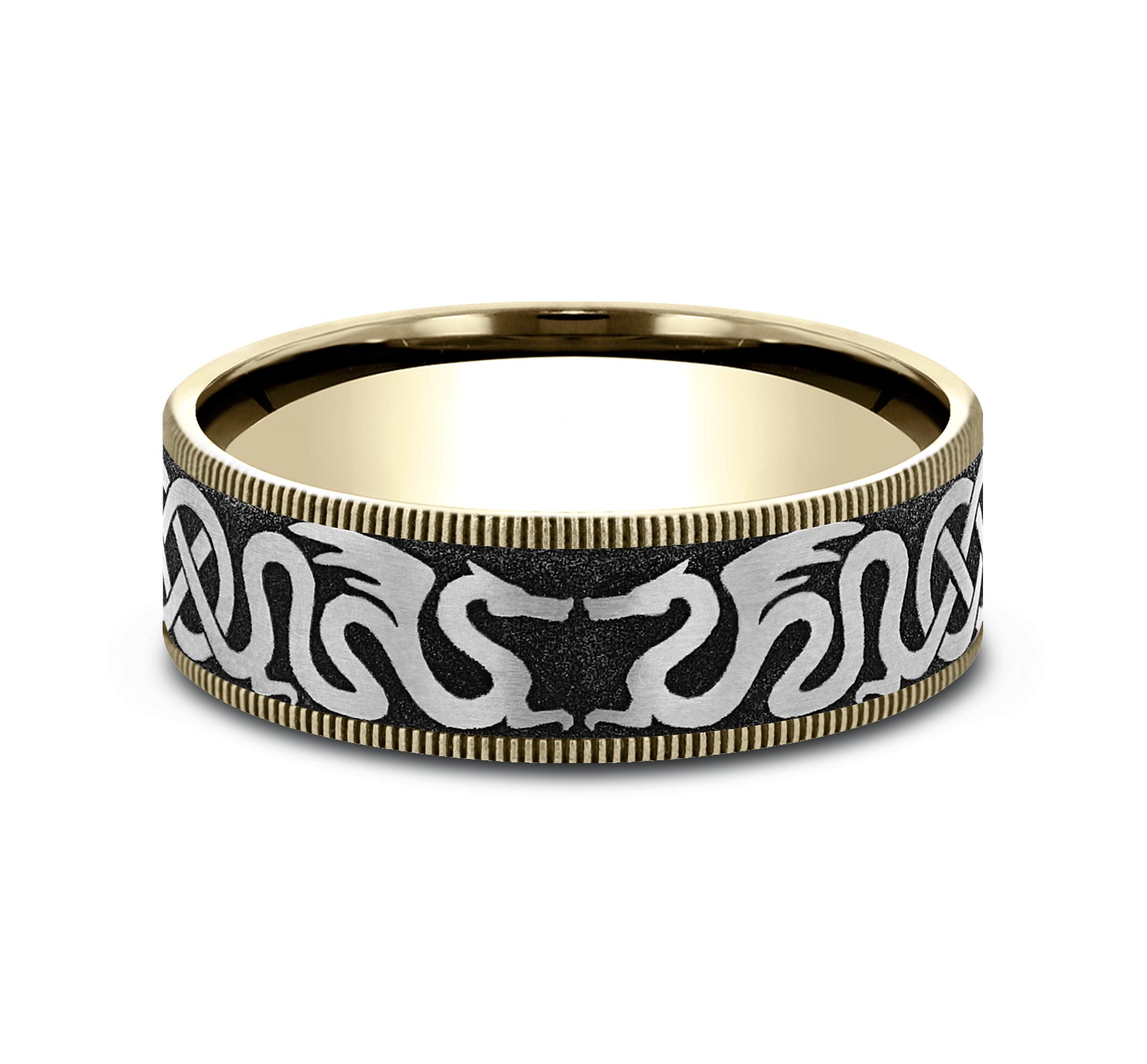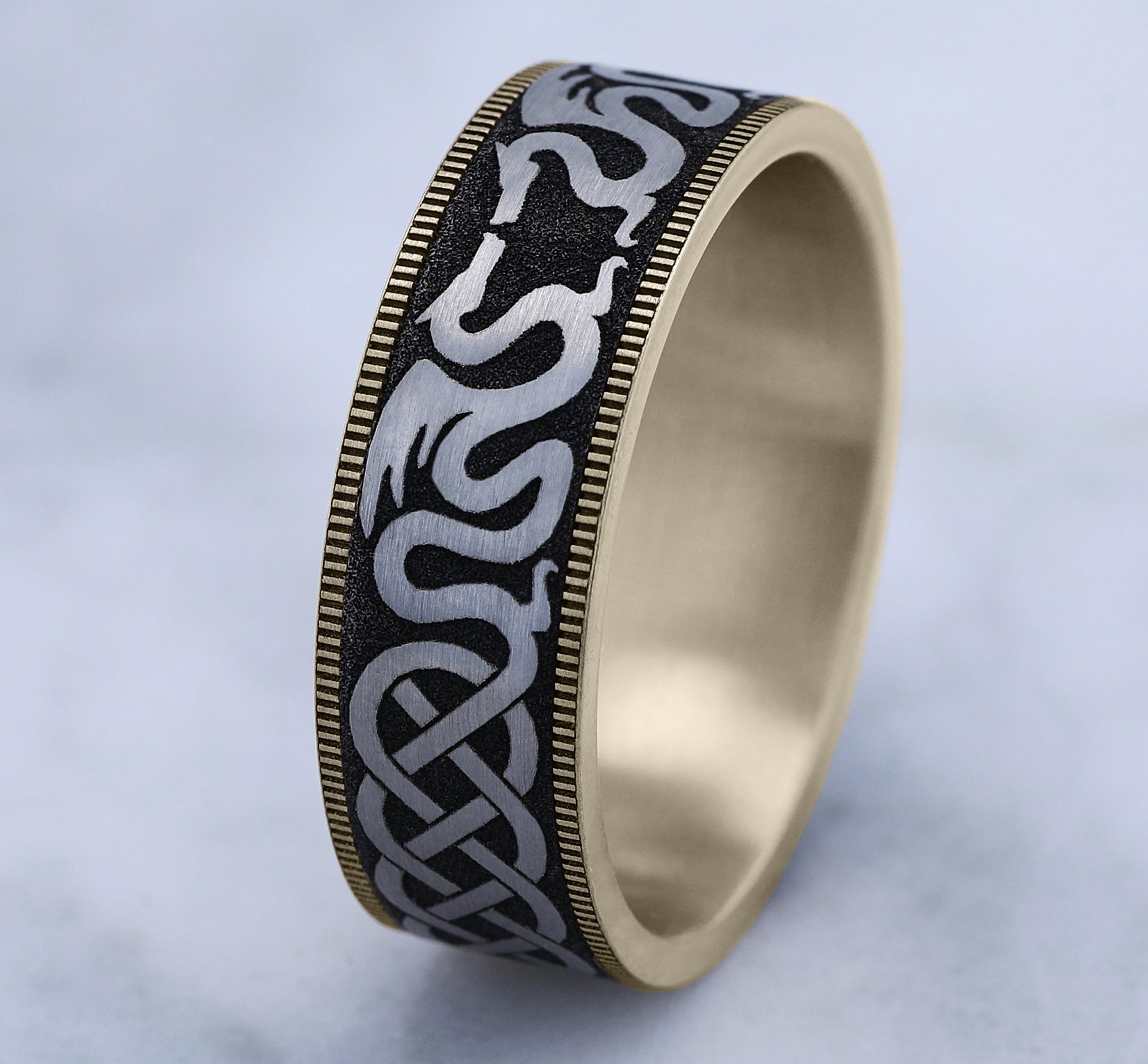 7.5mm, Comfort fit 14K Yellow Gold and Grey-Black Titanium Dragon and celtic knot design, thin edges