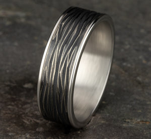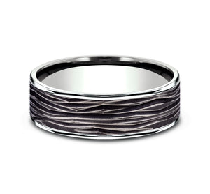 7.5mm, Comfort fit 14K White Gold and Black Titanium Horizontal bark patterned center, polished thin edges