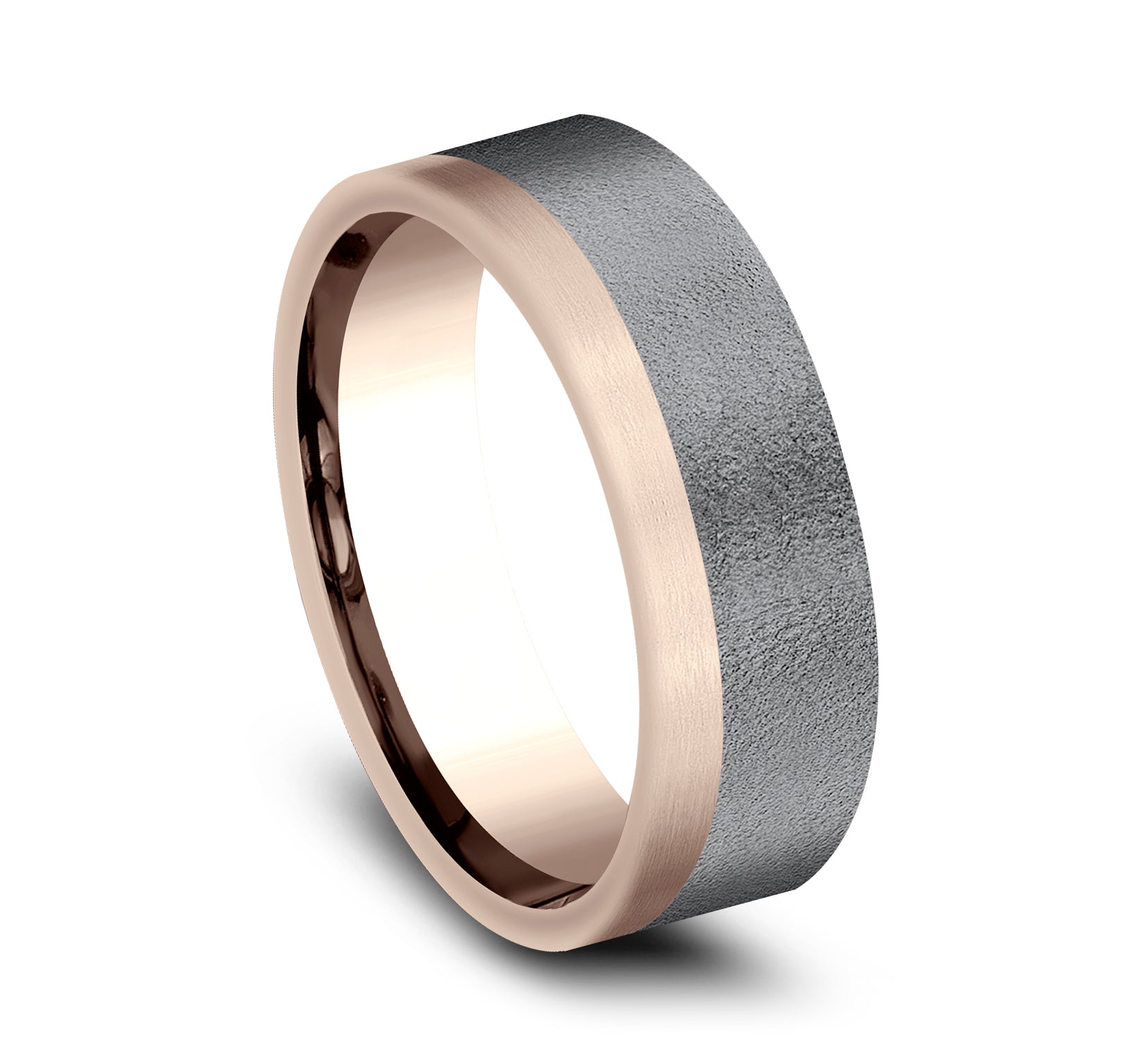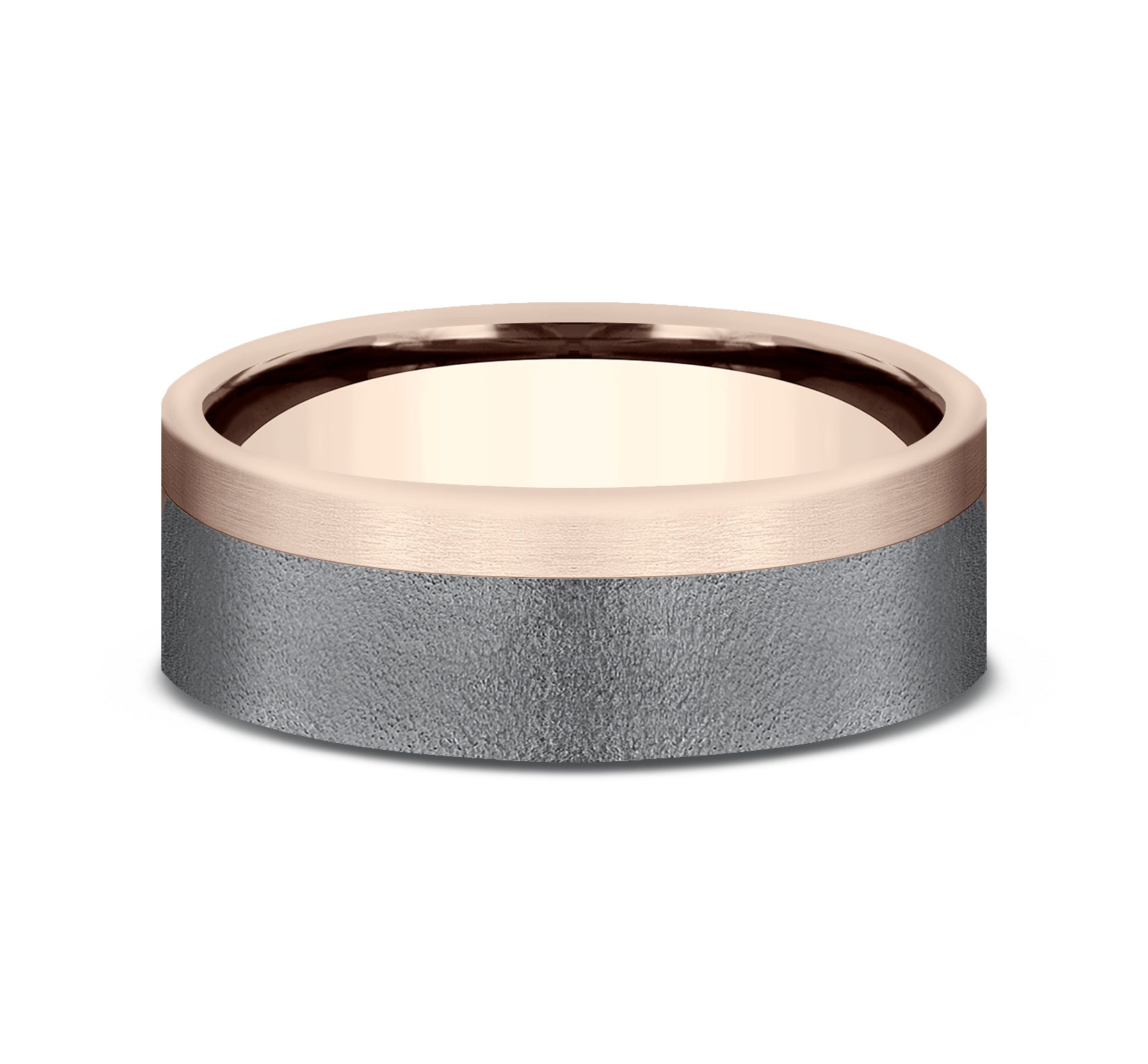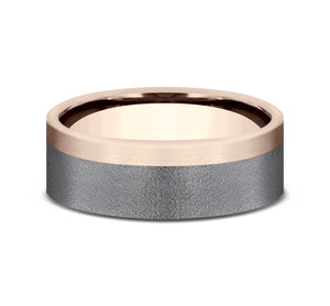 7mm, Comfort fit 14K Rose Gold and Darkened Tantlaum Wire brush finish, one satin edge