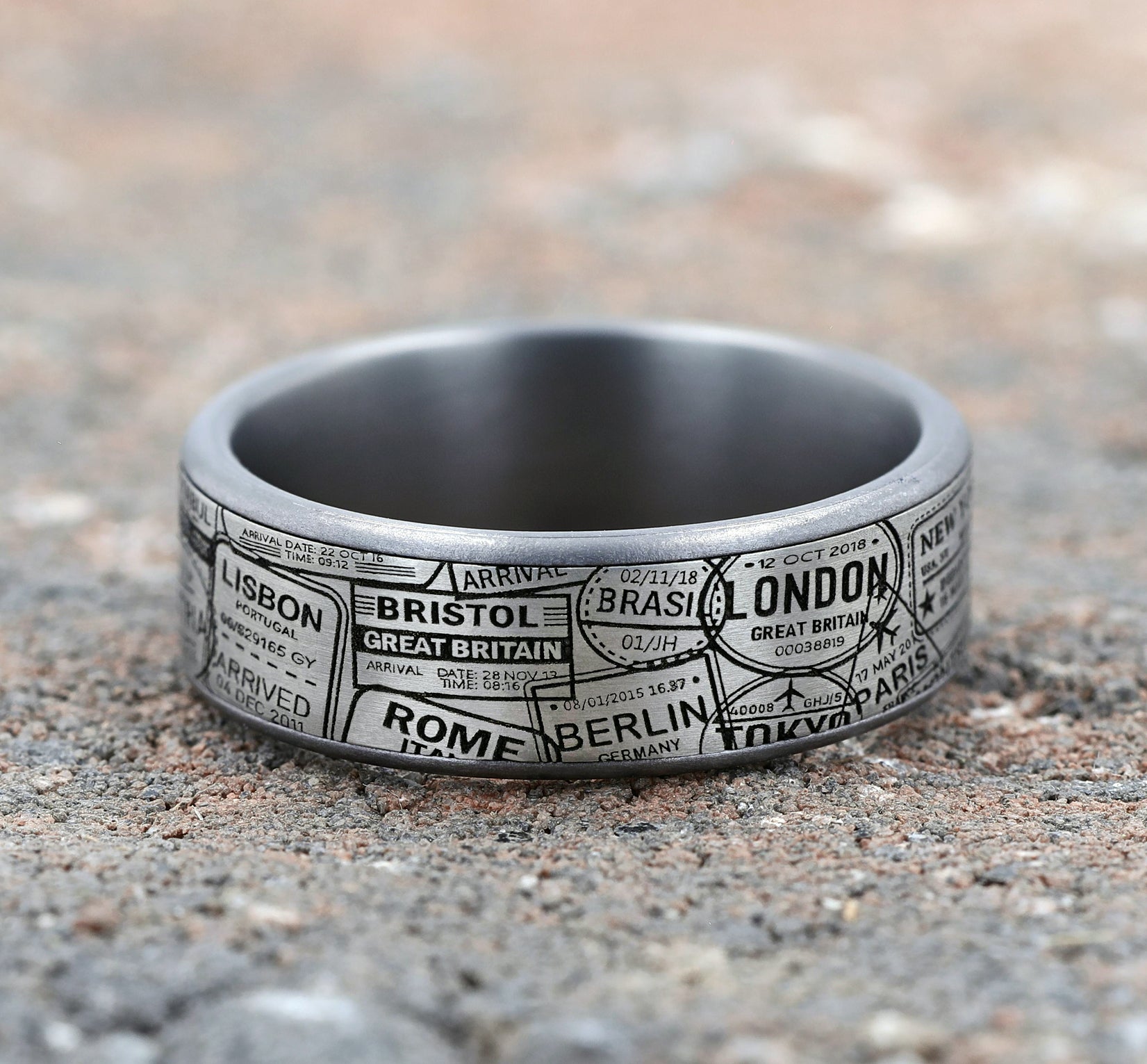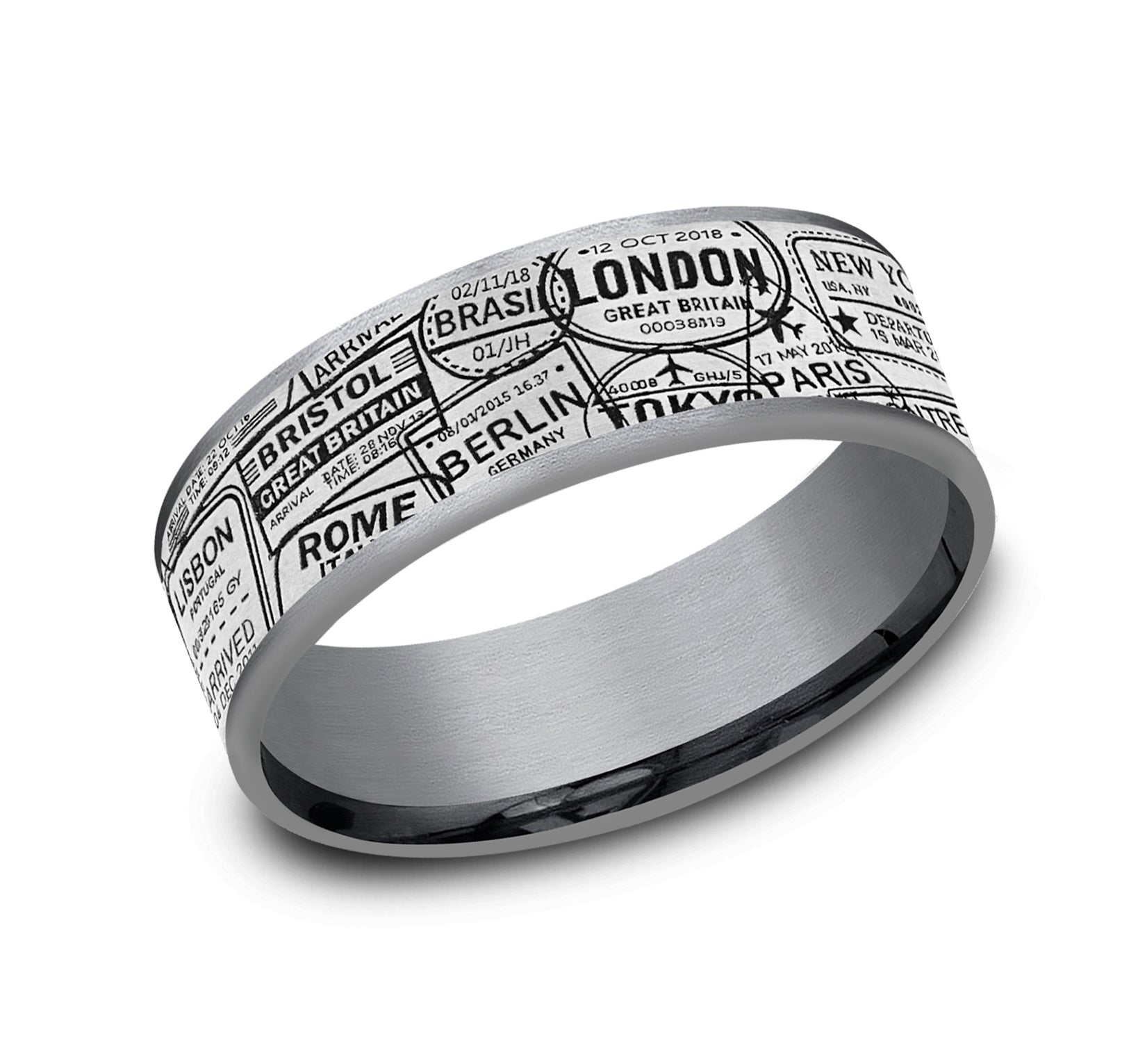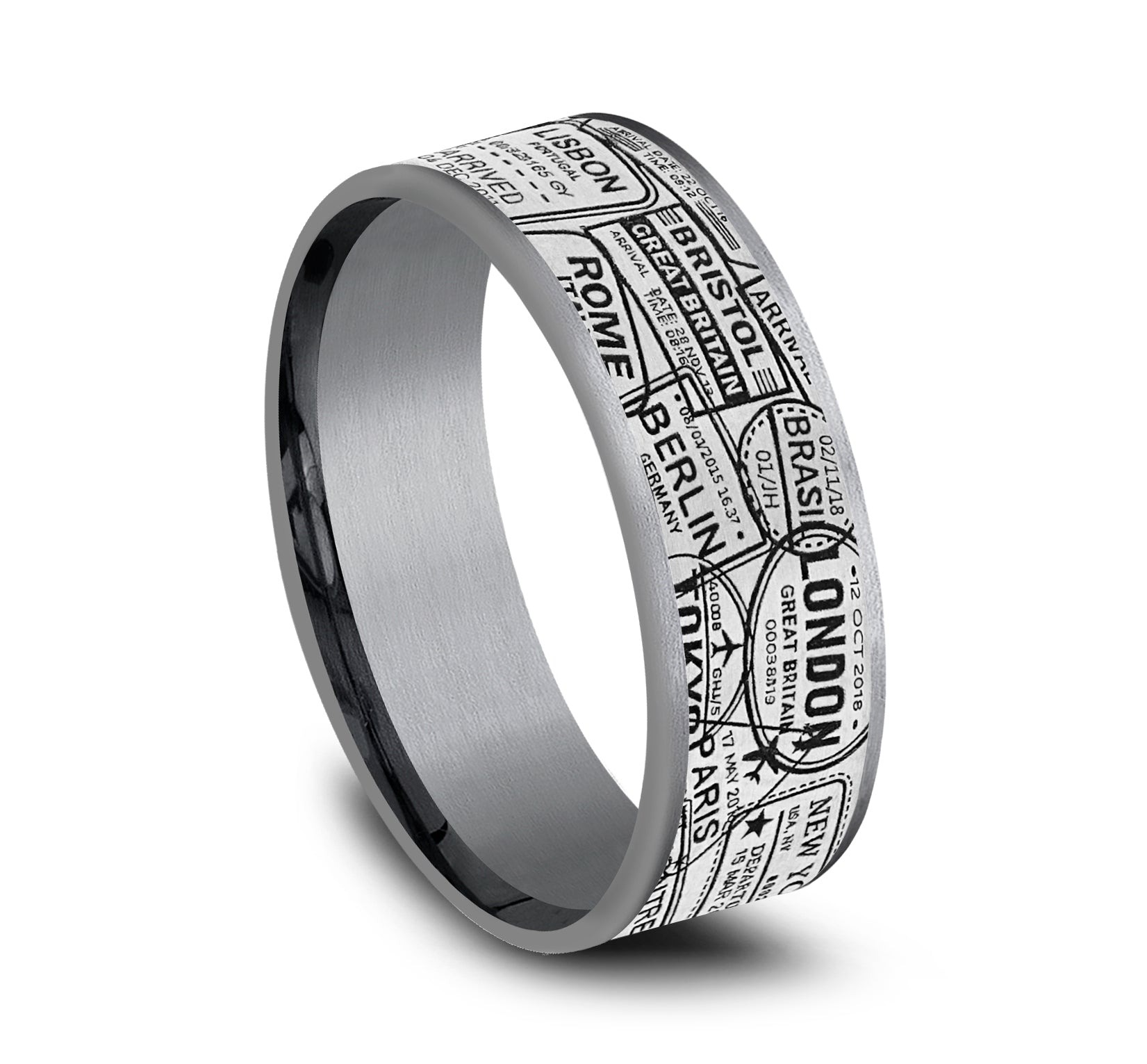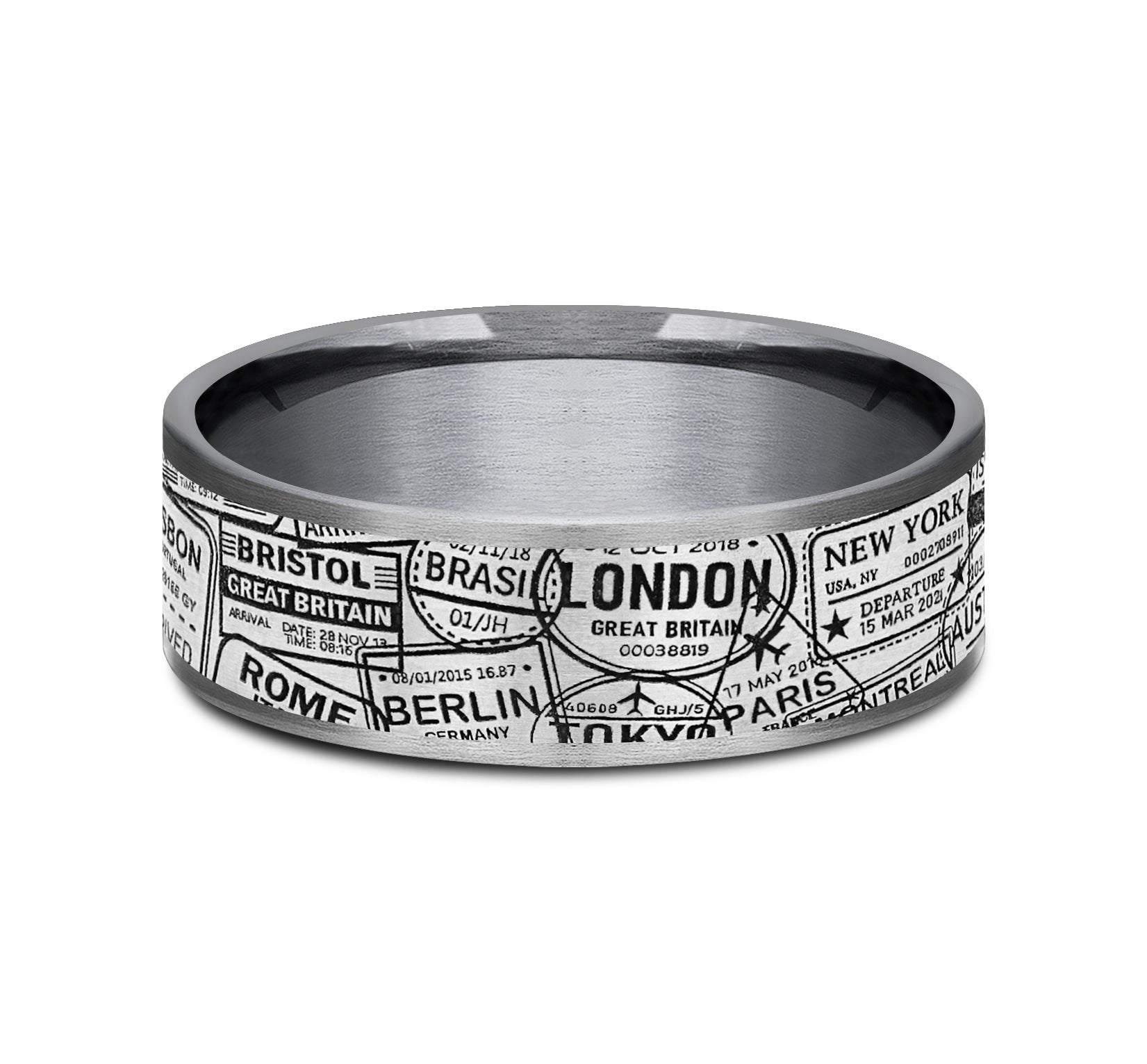7.5mm, Comfort fit Grey Tantalum and Grey/Black Titanium Visa Stamp pattern, thin edges
