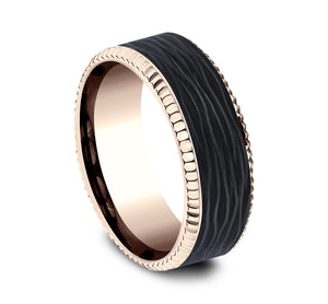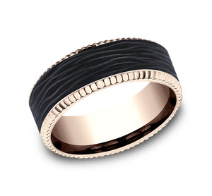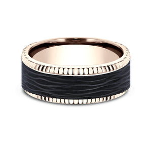 8mm, Comfort fit 14K Rose Gold and Forged Carbon Fiber Forged carbon fiber center, fluted bevel edges