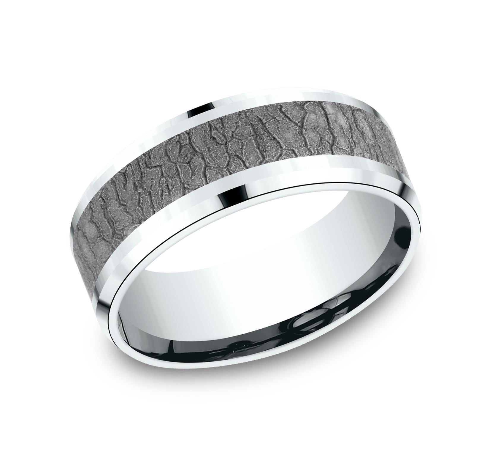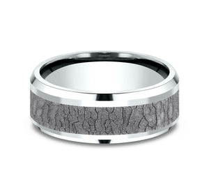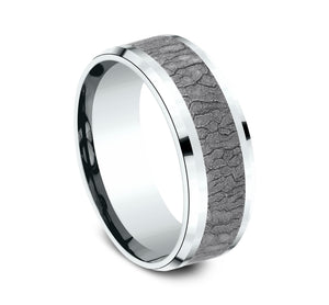 8mm, Comfort fit 14K White Gold and Grey Tantalum Tree bark patterned center, polished drop bevel edges