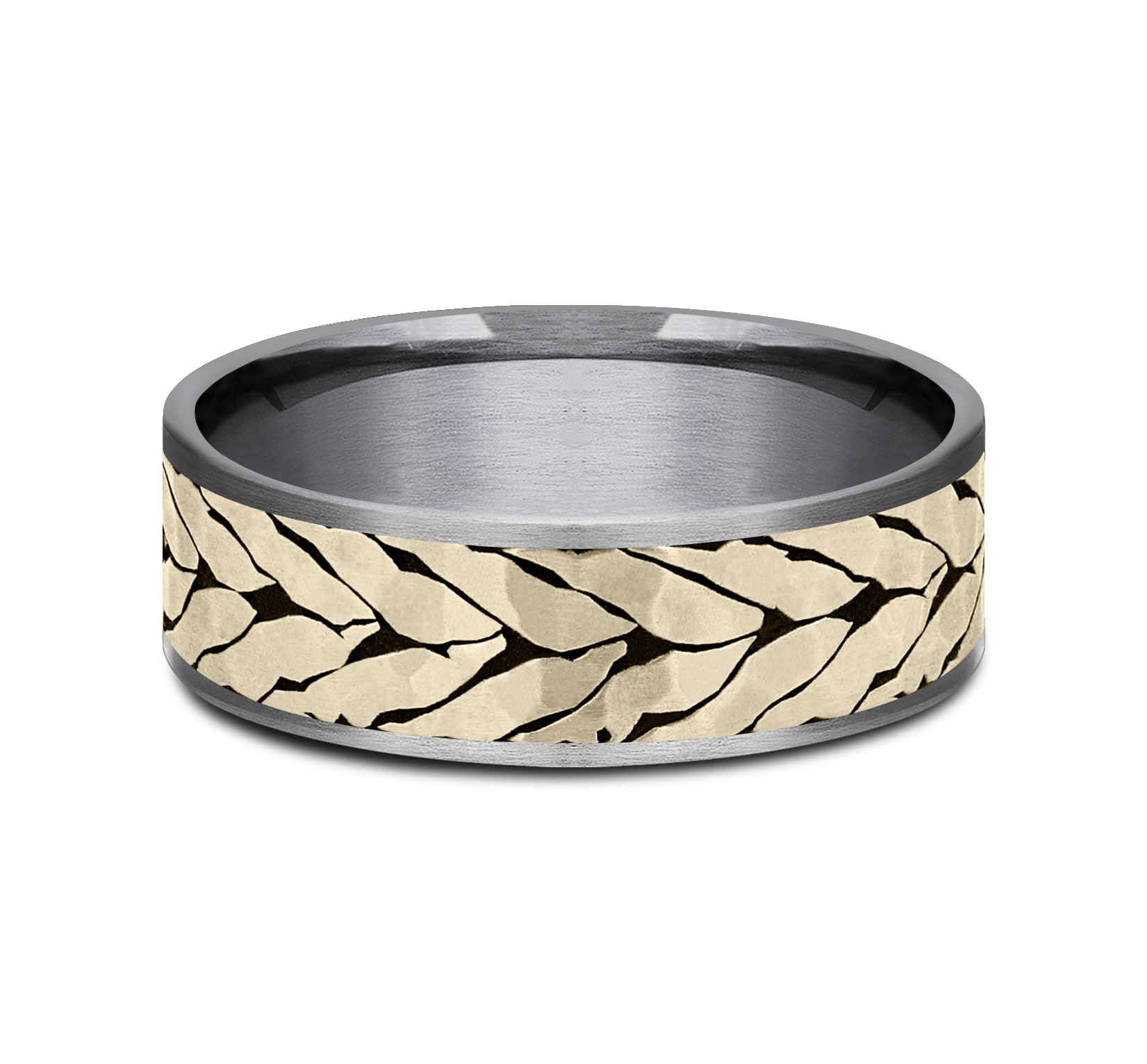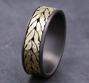 7.5mm, Comfort fit Grey Tantalum and 14K Yellow Gold Hammered chevron pattern, thin edges