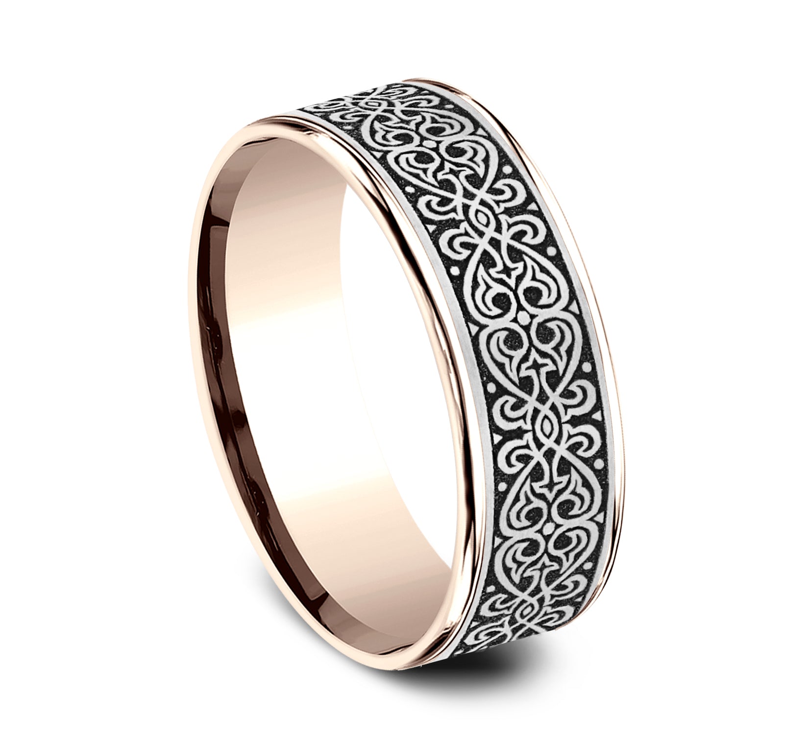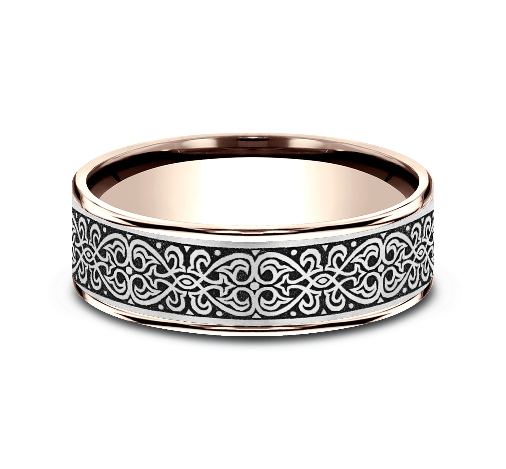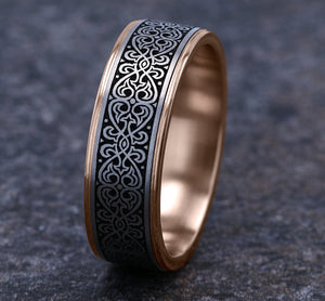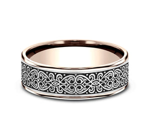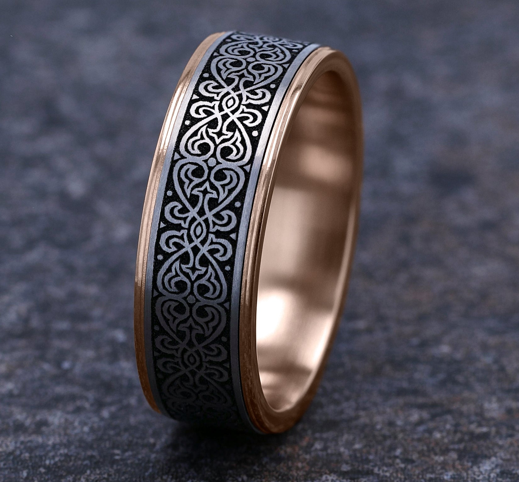 7.5mm, Comfort fit 14K Rose Gold and Grey/Black Titanium Ottoman Knot pattern, thin edges