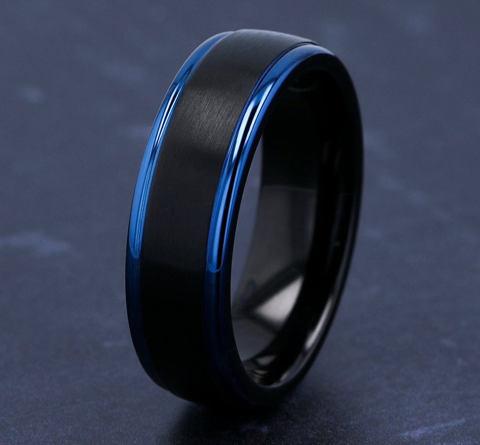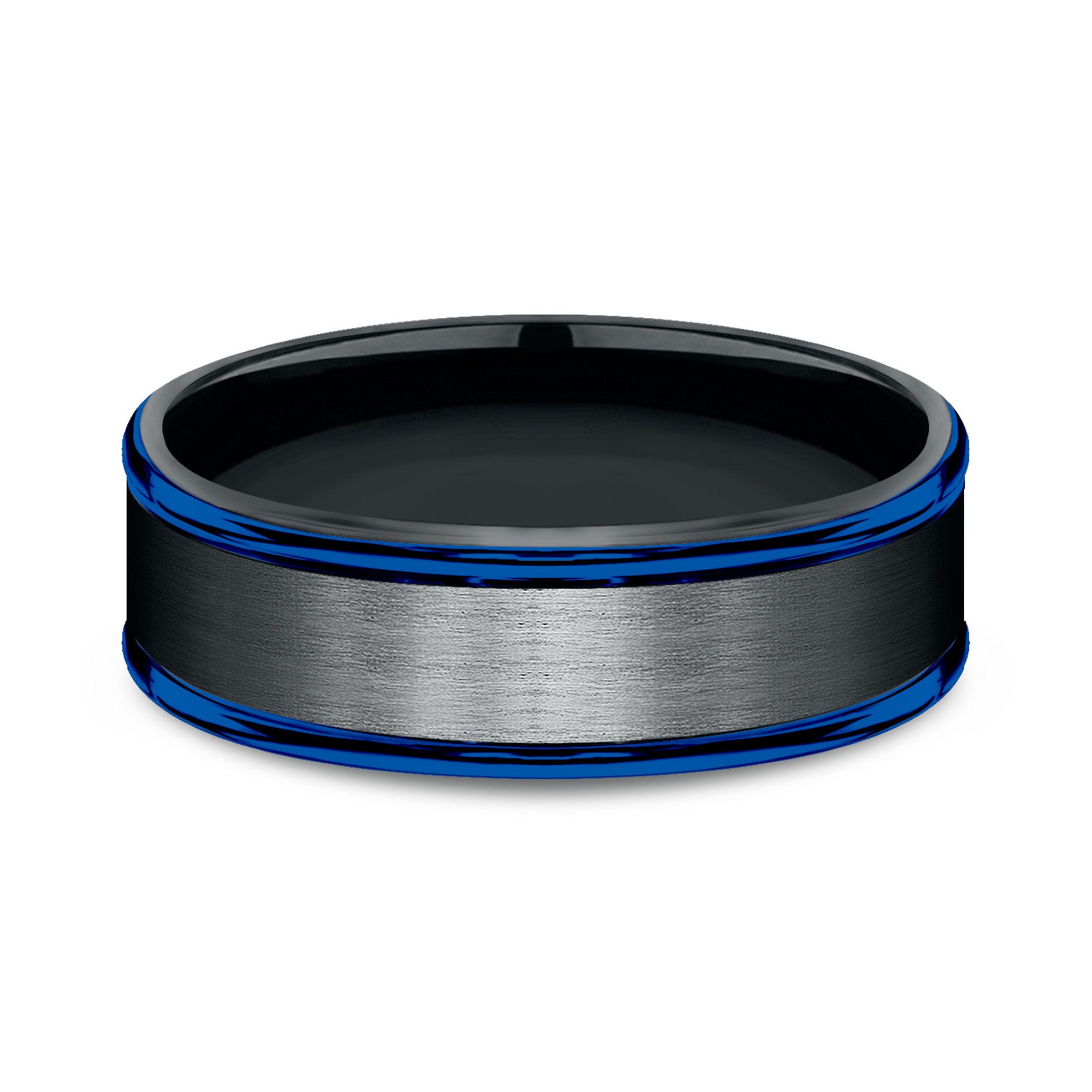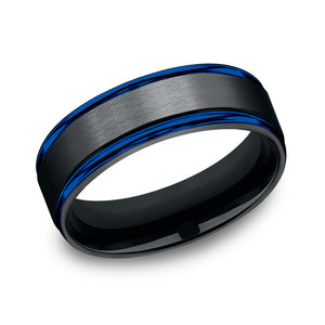 7mm, Comfort fit Black Cobalt Satin center, blue round edges