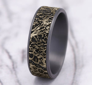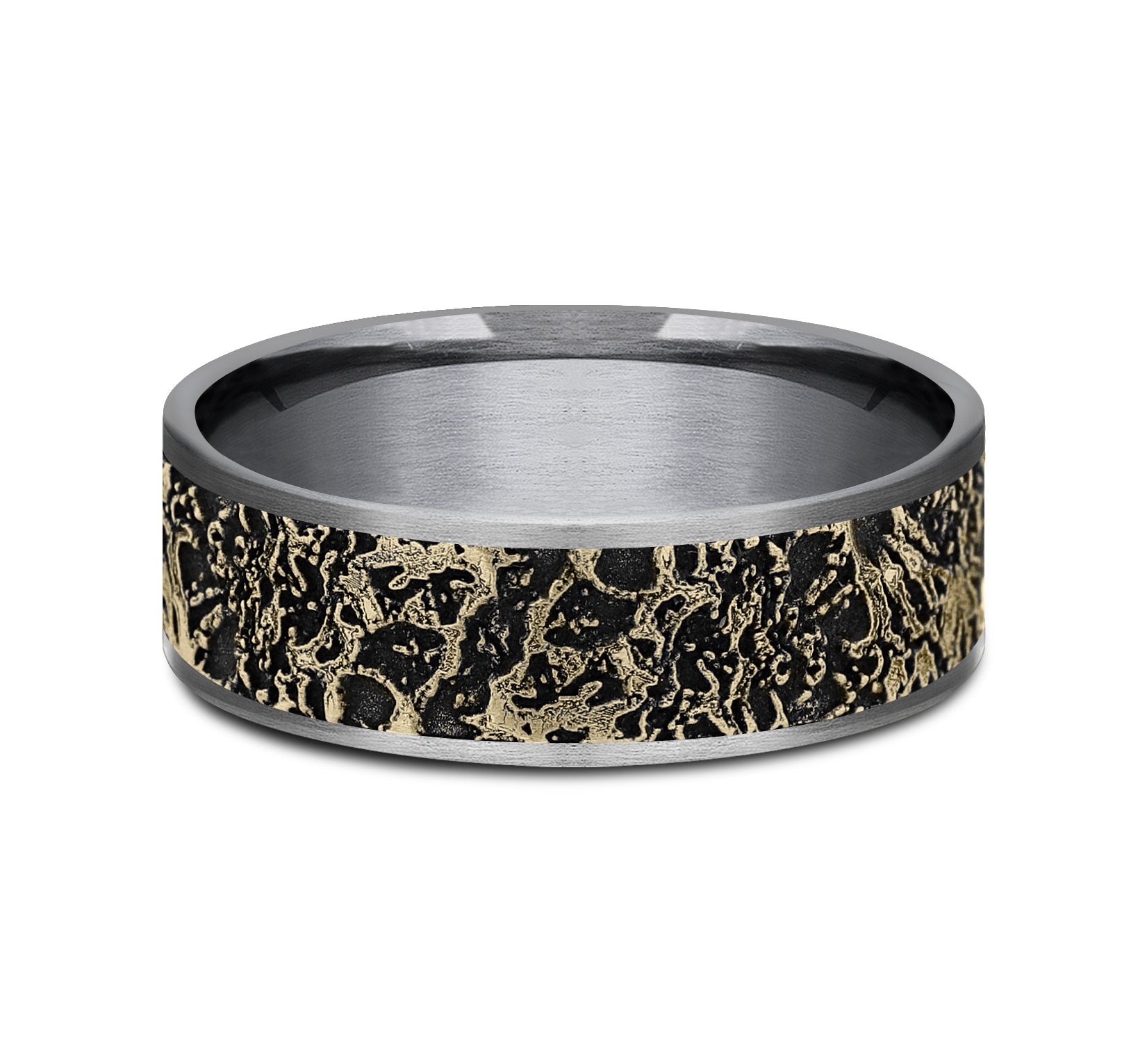 7.5mm, Comfort fit Grey Tantalum and 14K Yellow Gold Abstract pattern, thin edges