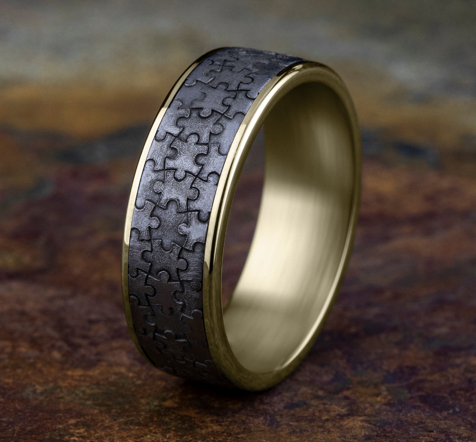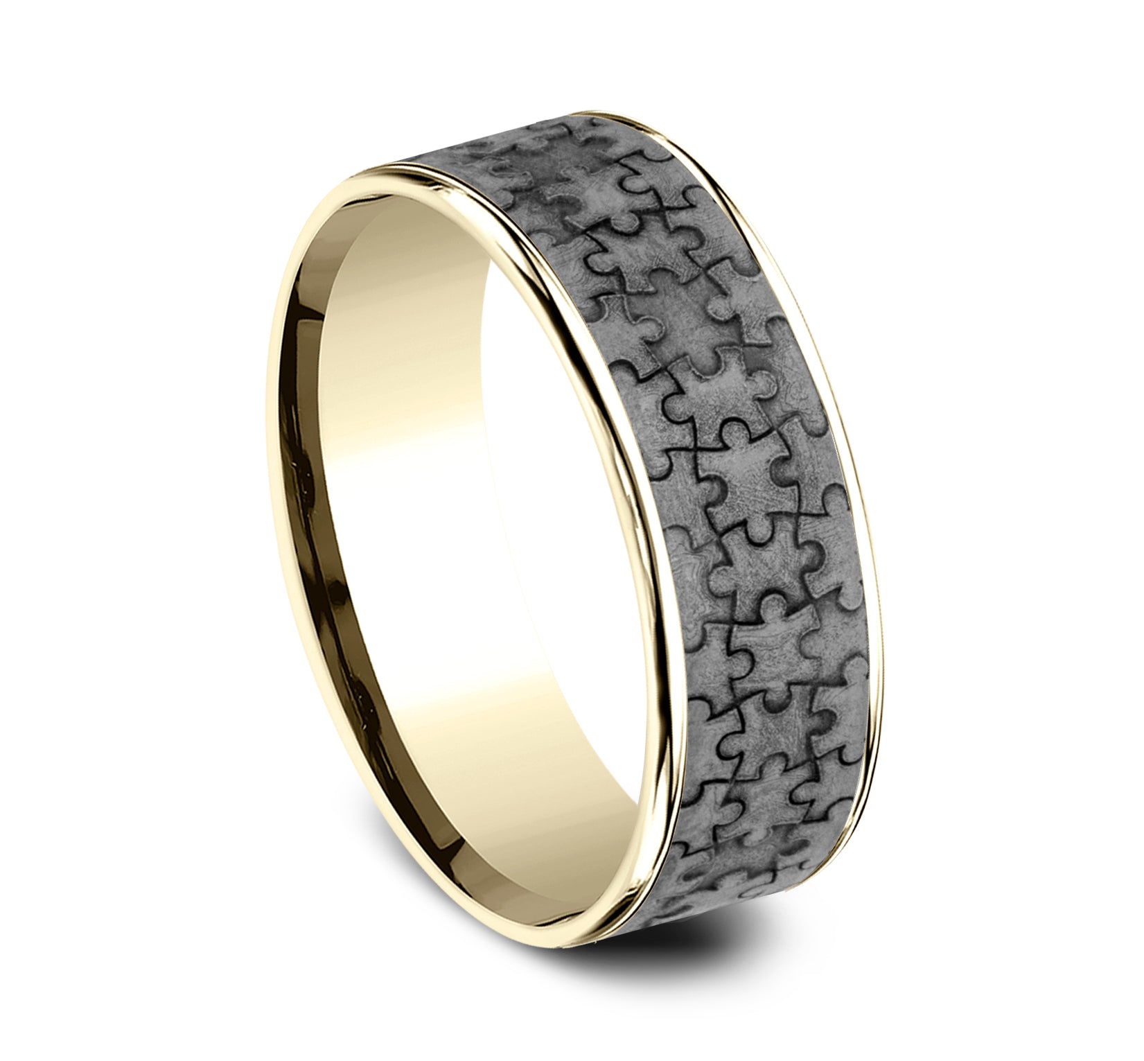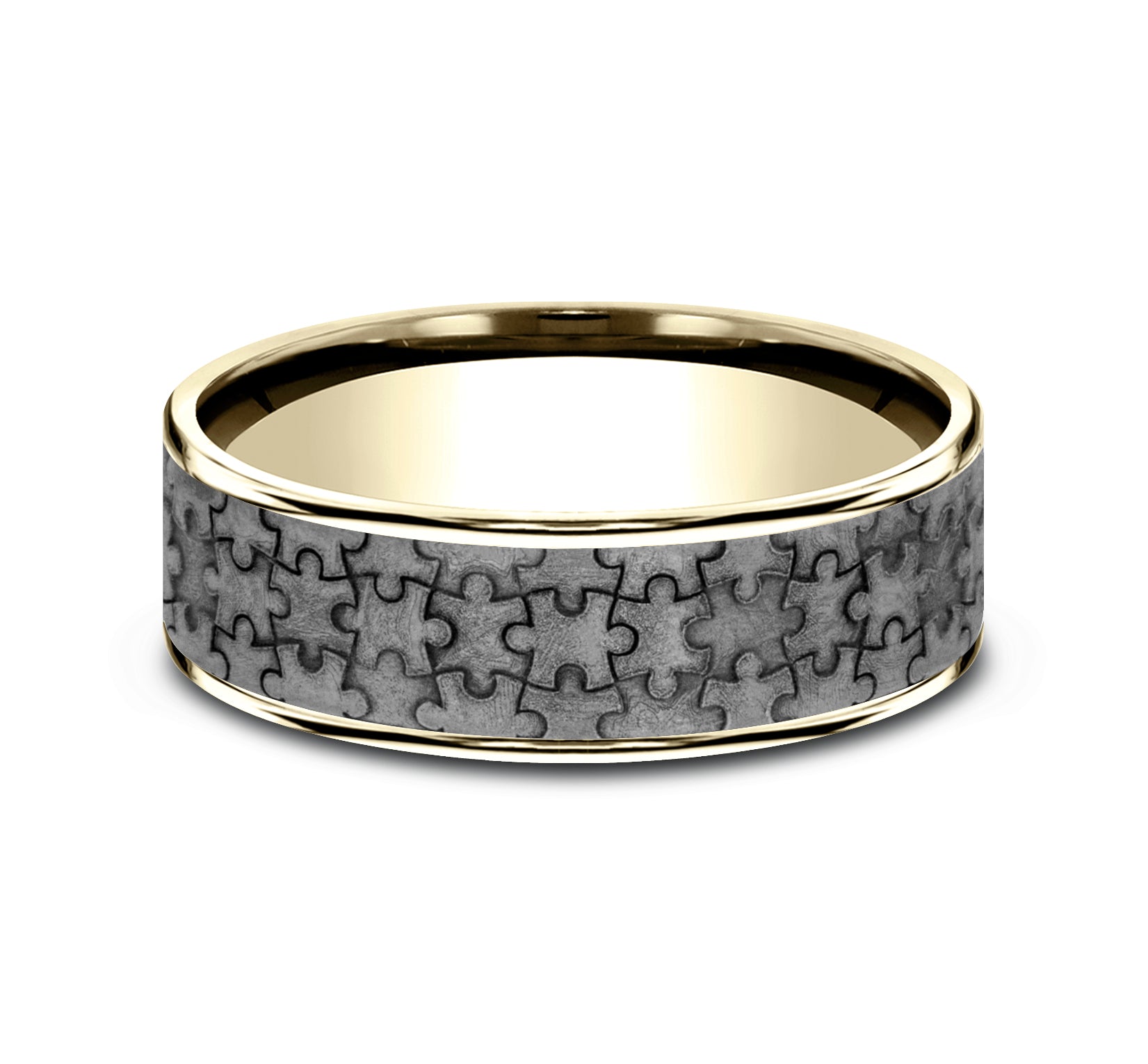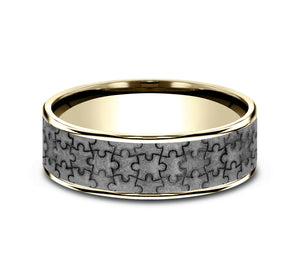 7.5mm, Comfort fit 14K Yellow Gold and Grey Tantalum Puzzle patterned center, thin edges