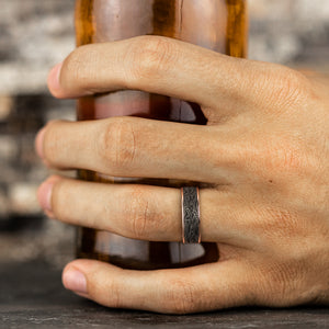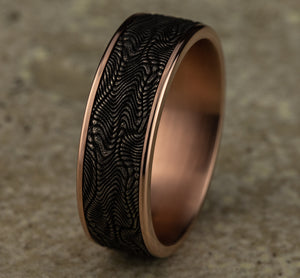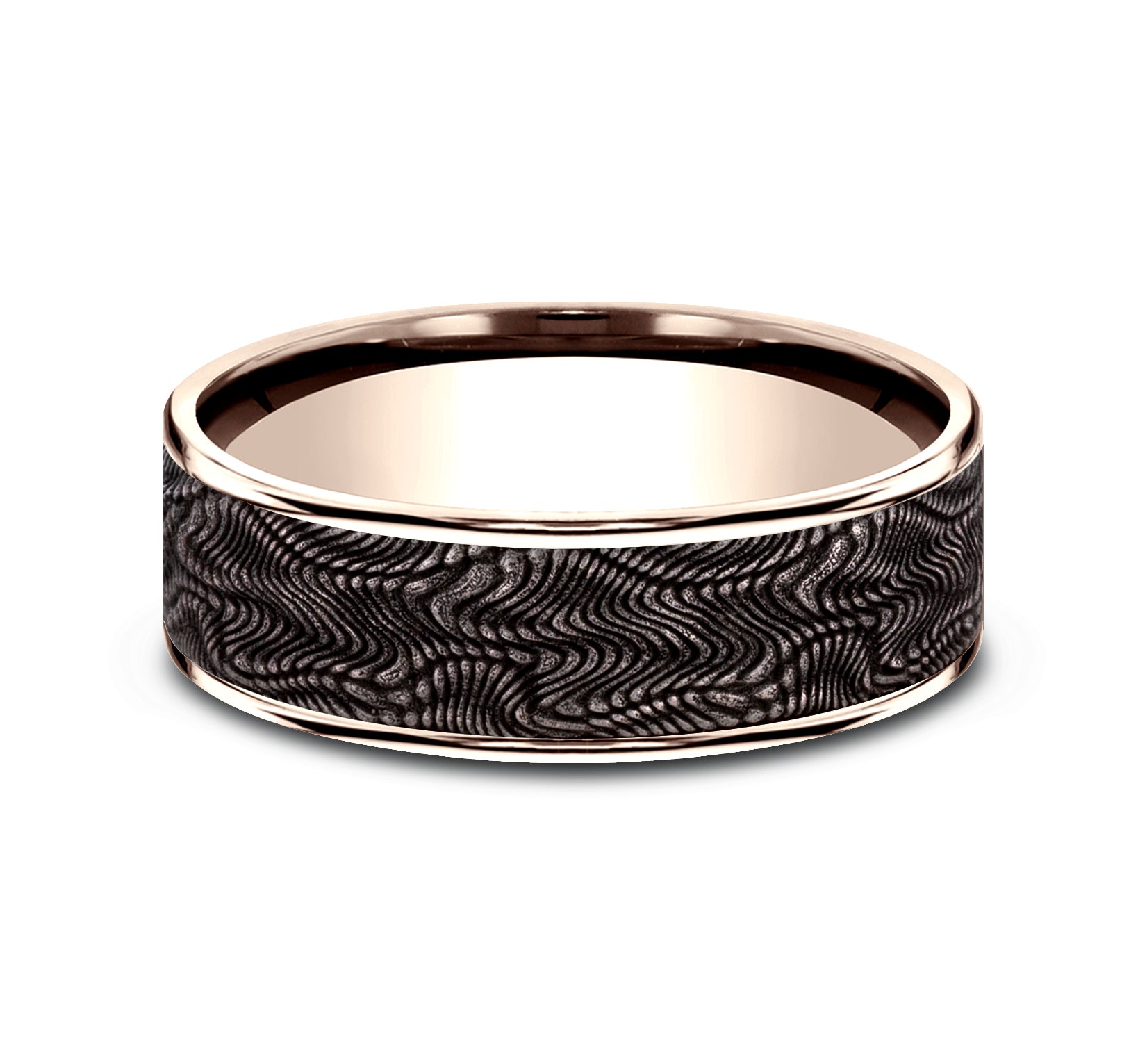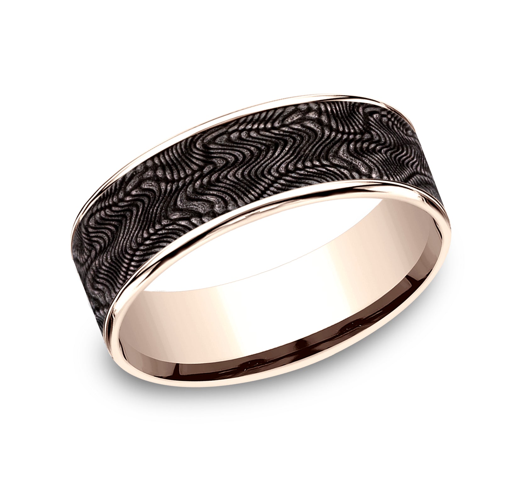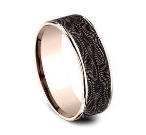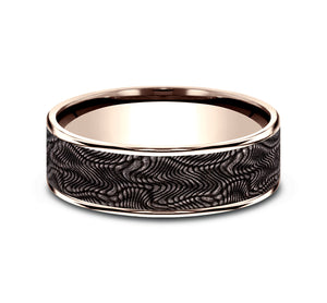 7.5mm, Comfort fit 14K Rose Gold and Grey Tantalum Snakeskin patterned center, polished thin edges
