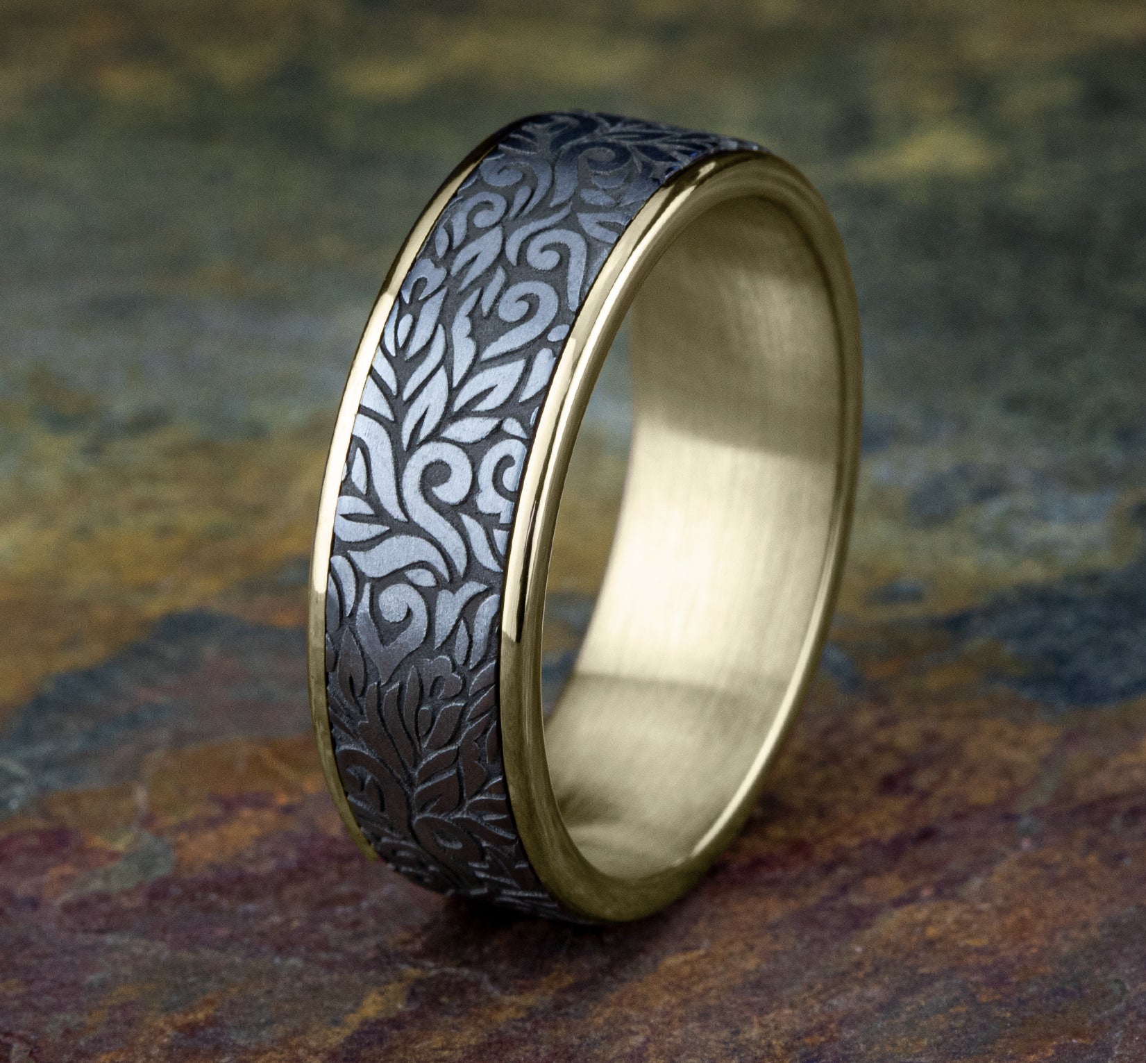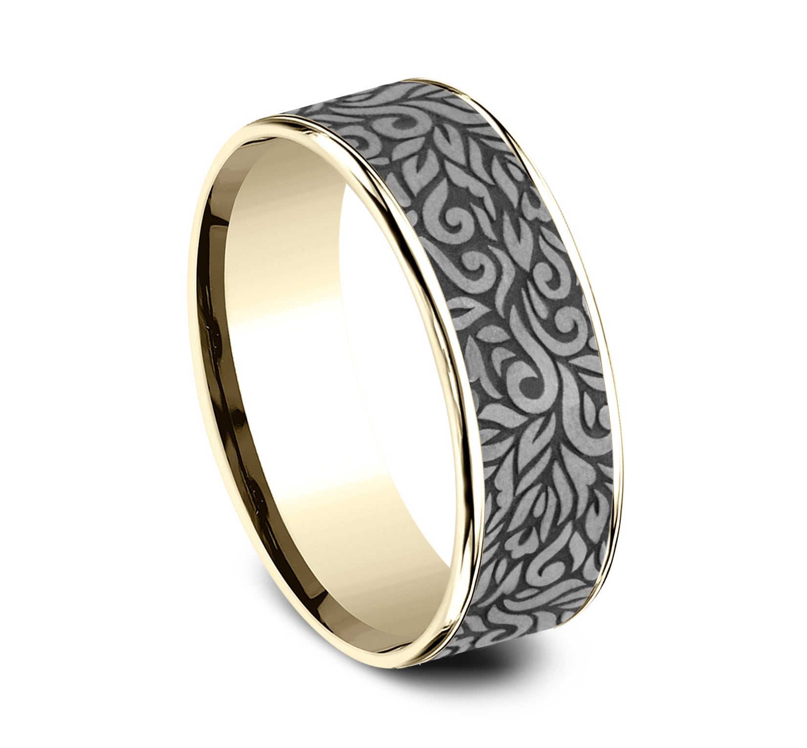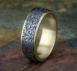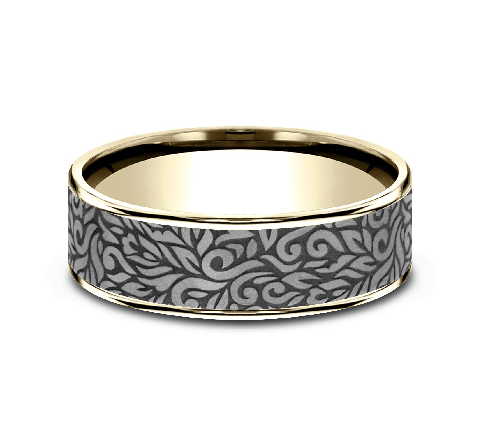 7.5mm, Comfort fit 14K Yellow Gold and Grey Tantalum Paisley patterned center, thin edges