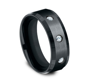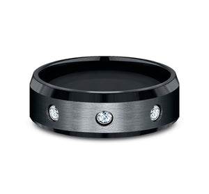 8mm, Comfort fit Black Cobalt Satin finish center, polished bevel edges 3 burnish set diamonds Carat weight is .18ct