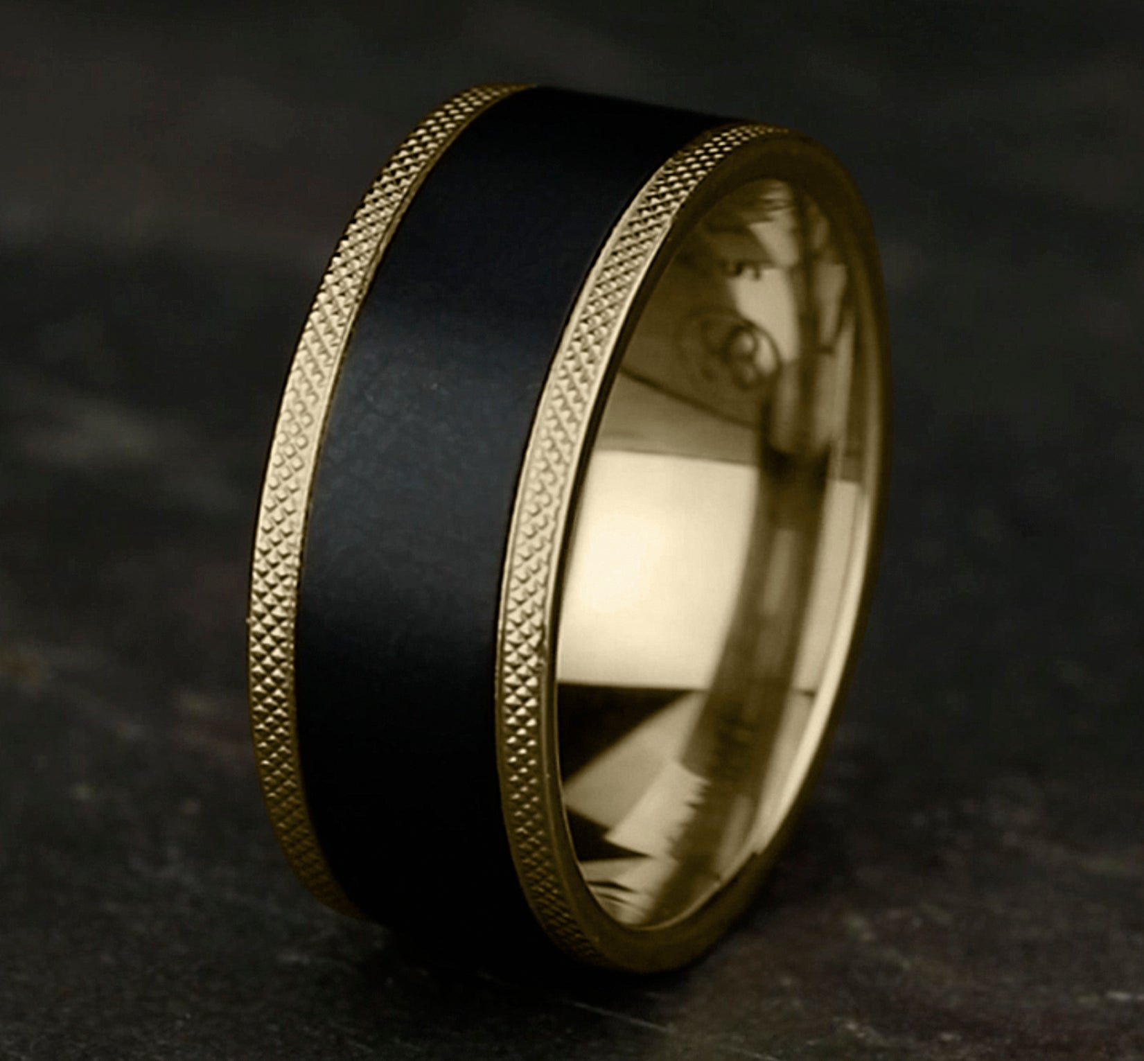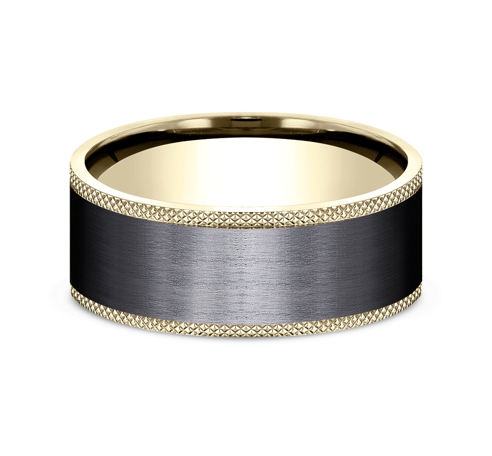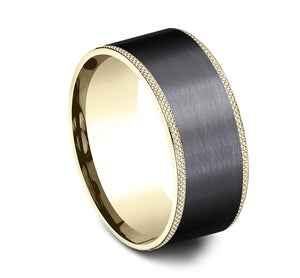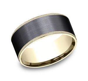 9mm, Comfort fit 14K Yellow Gold and Black Titanium Satin finish center, knurl detailed edges