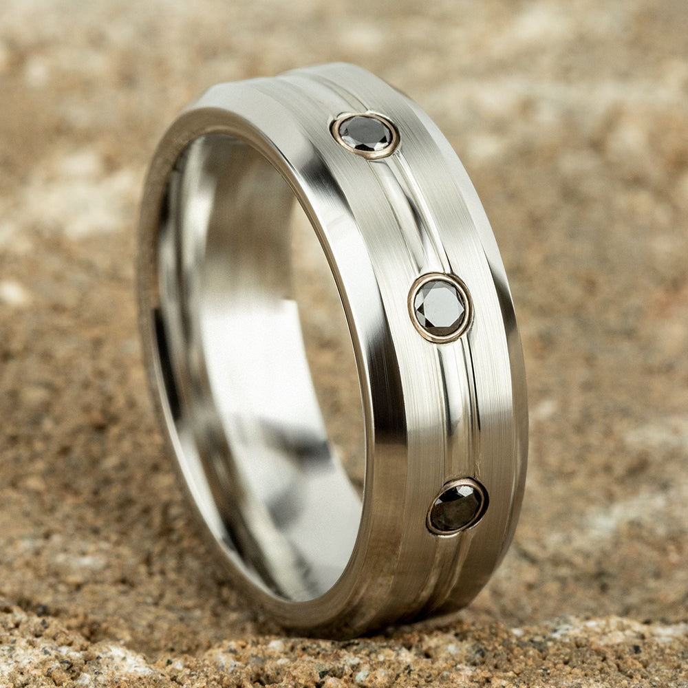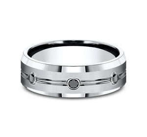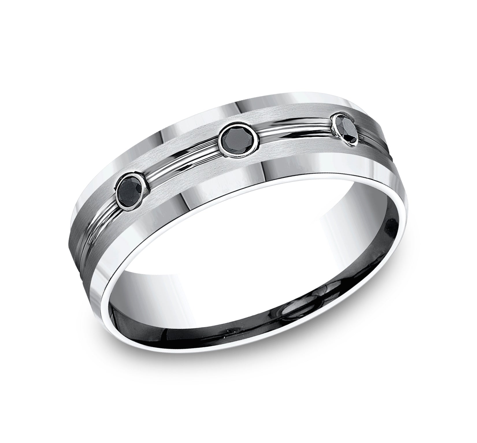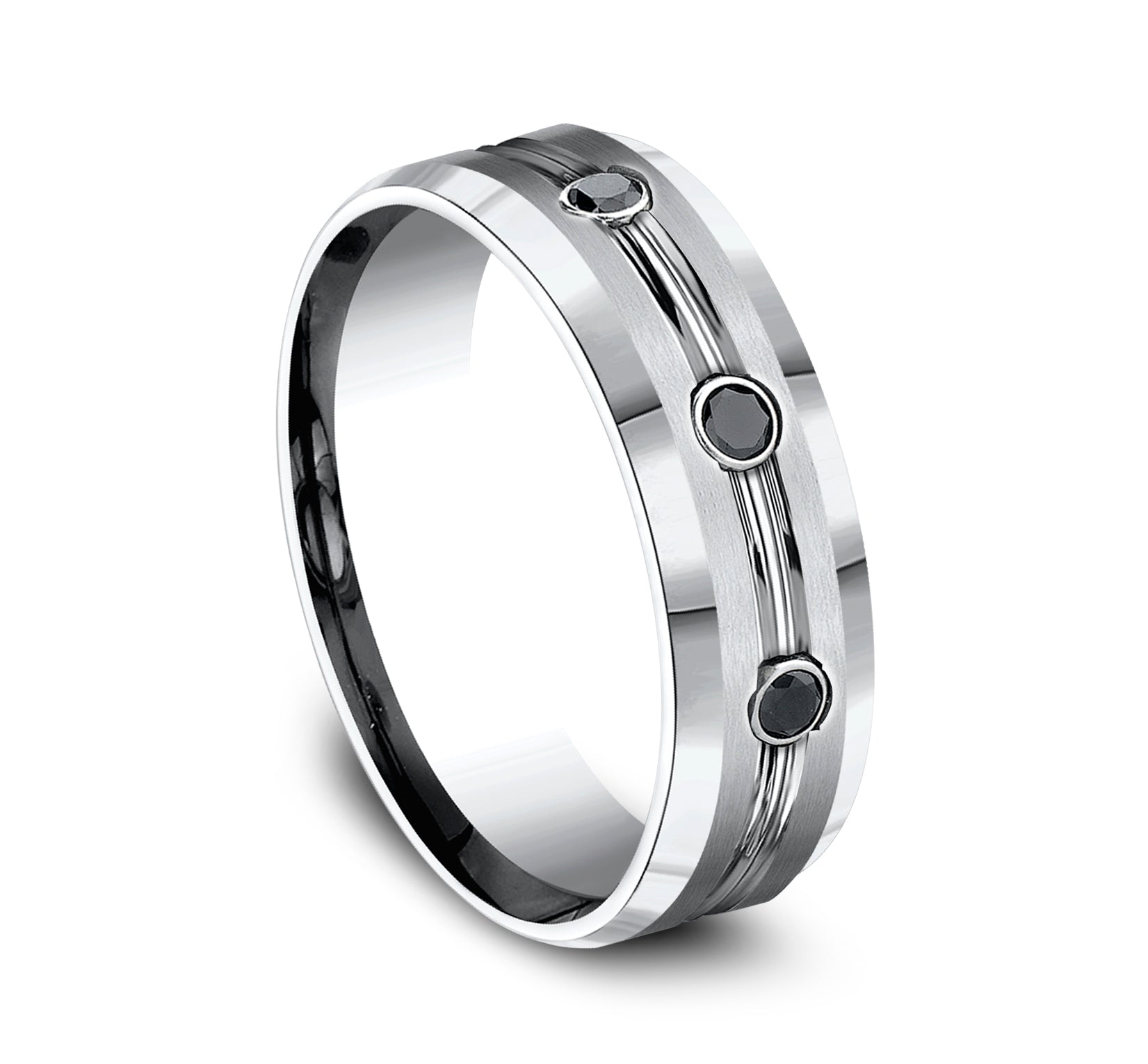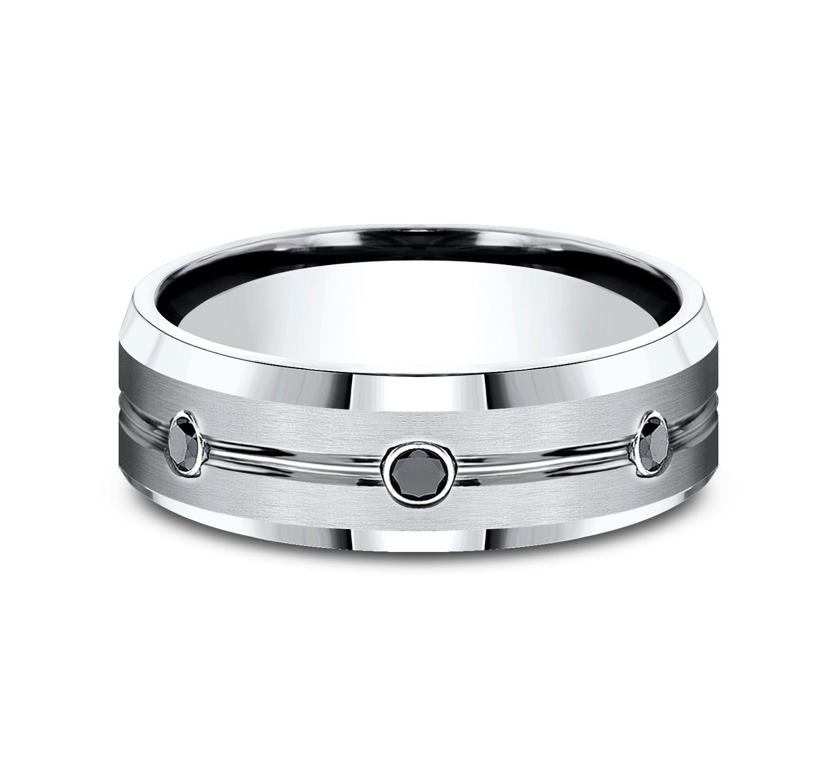 7.5mm, Comfort fit White Cobalt Satin center, polished double center cuts with black diamonds and bevel edges 3 burnish set black diamonds Carat weight is .20ct