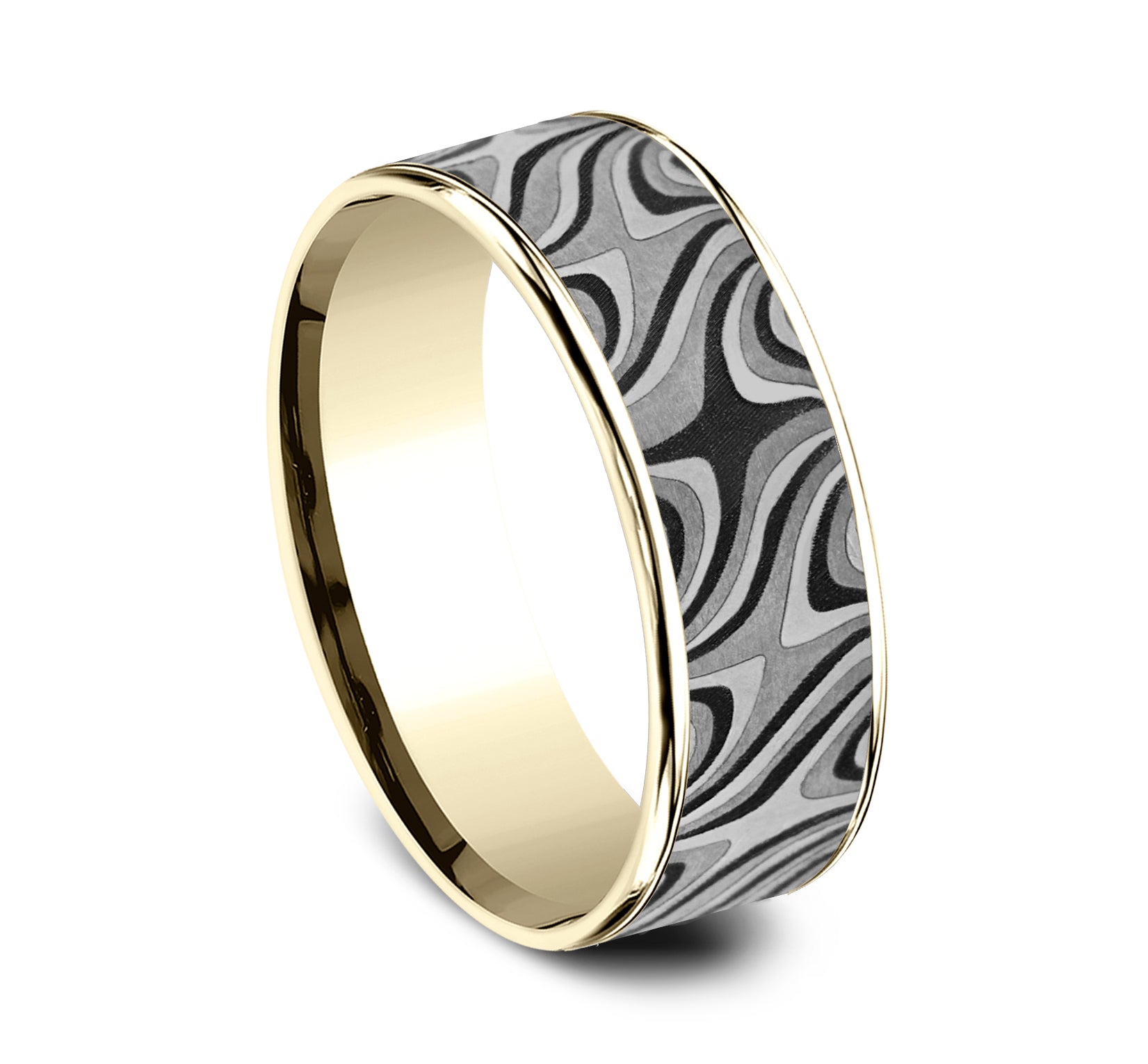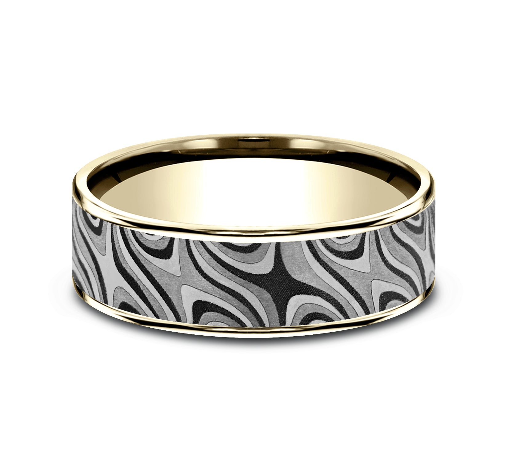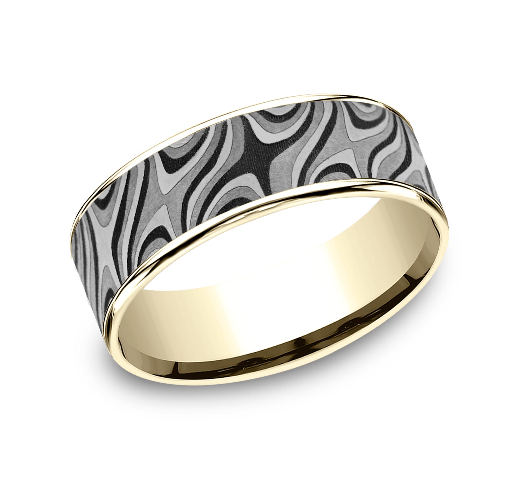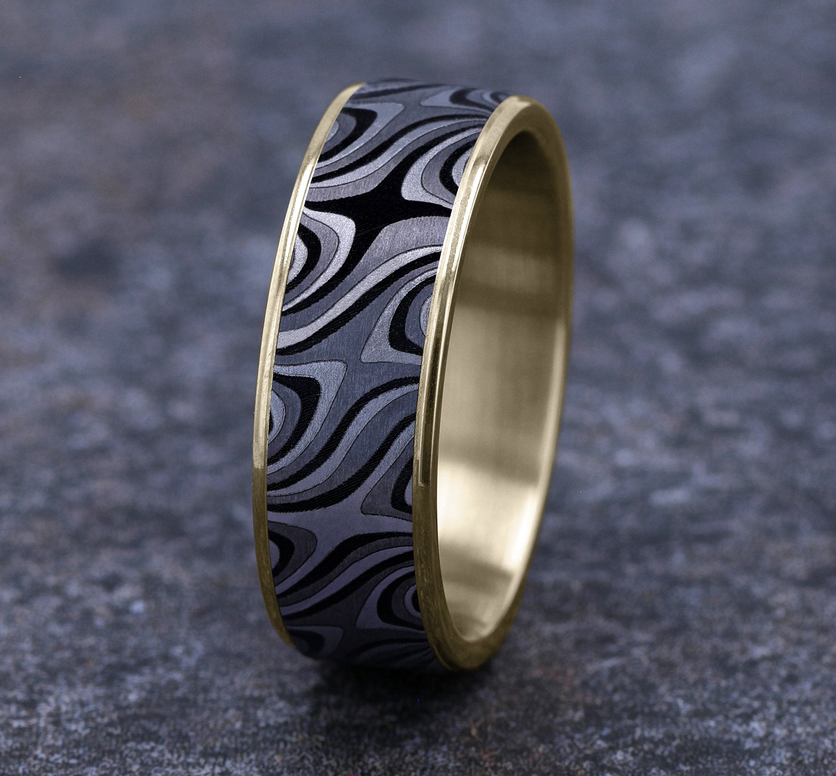 7.5mm, Comfort fit 14K Yellow Gold and Grey Tantalum Unique Tamascus designed center, thin edges