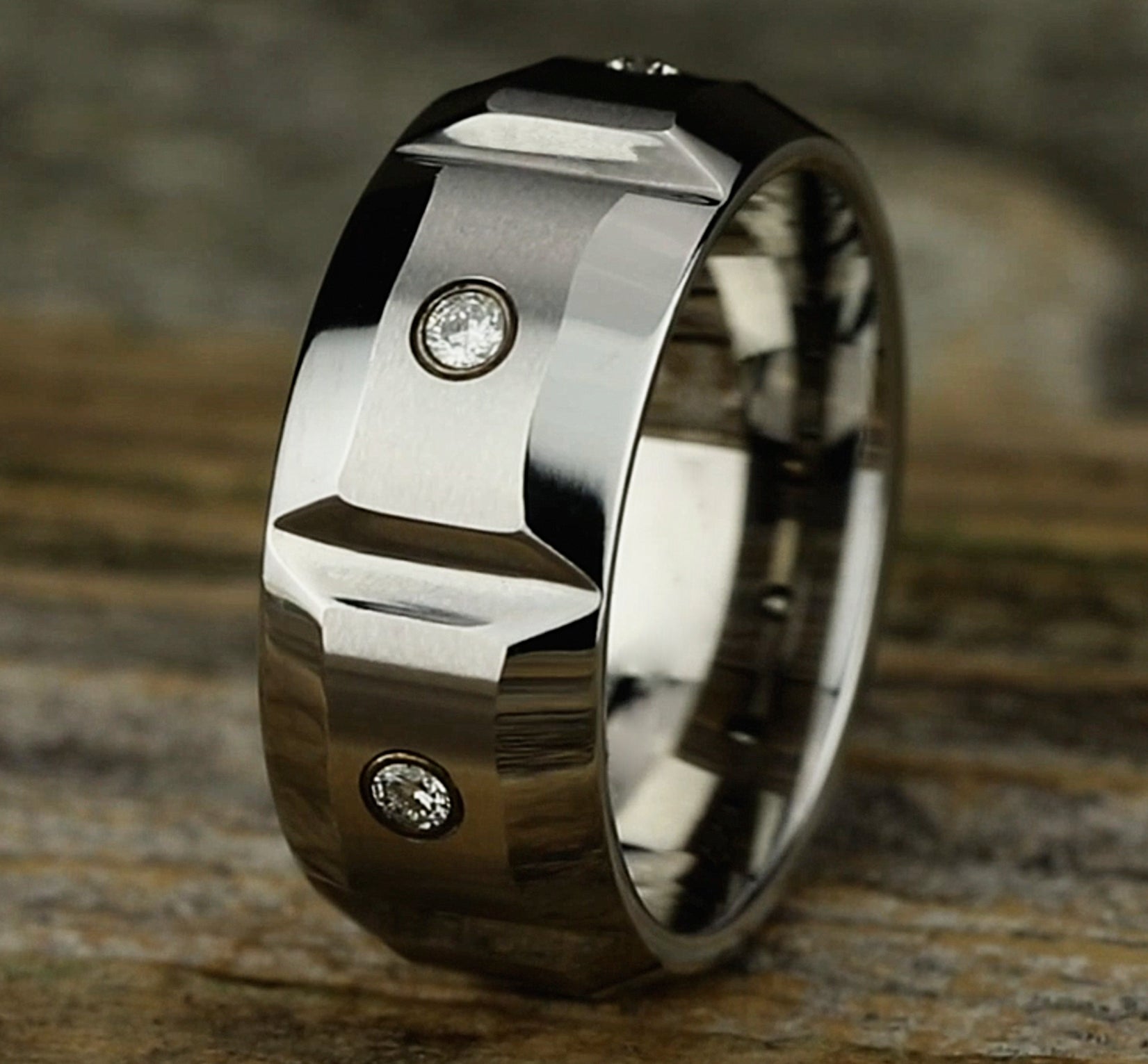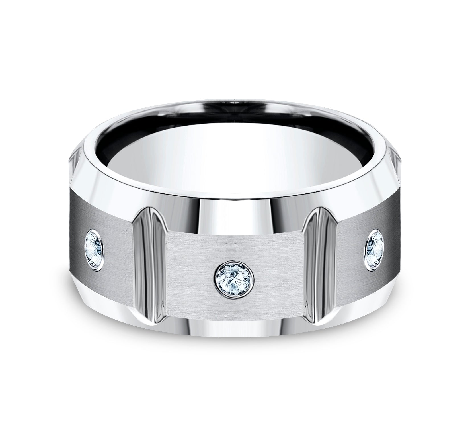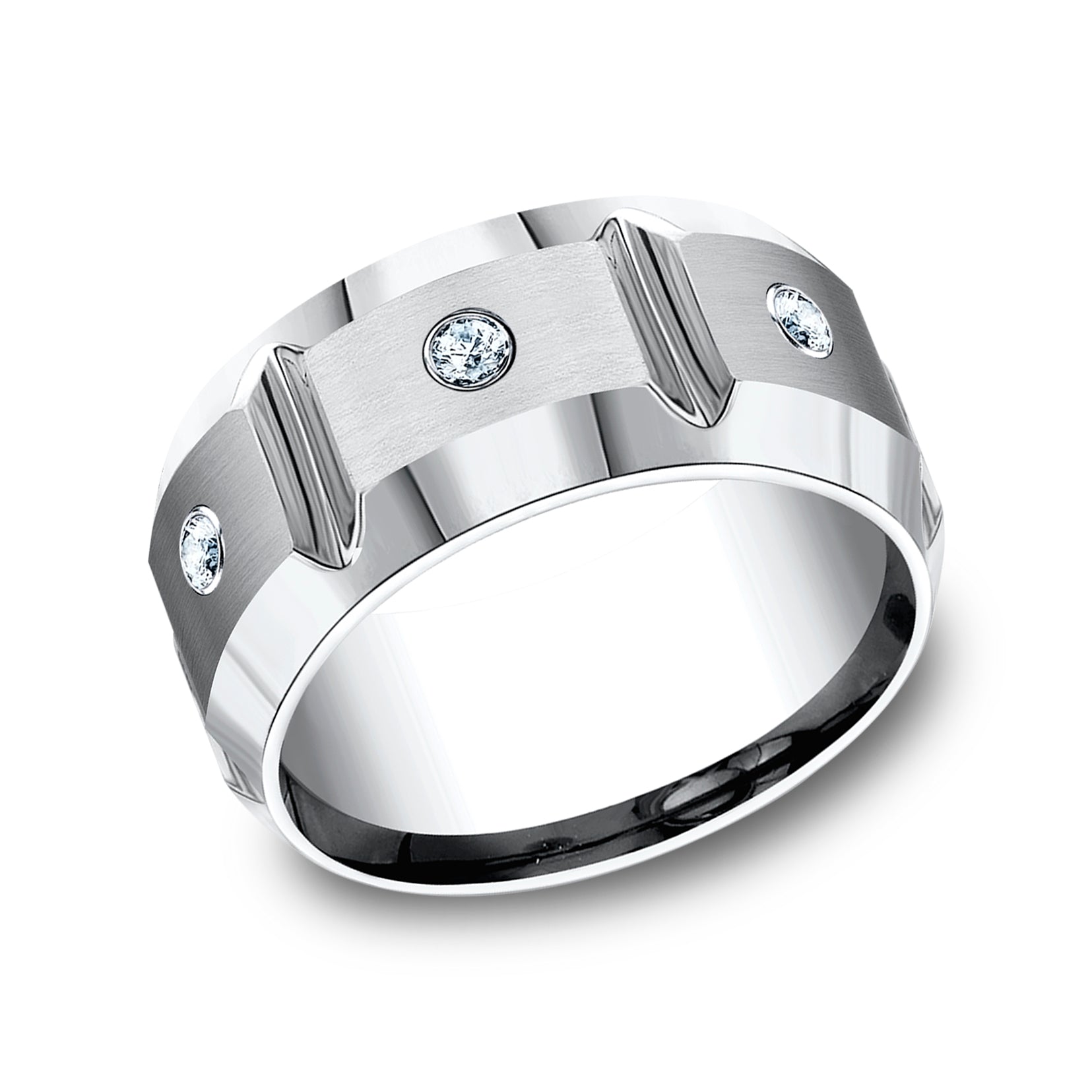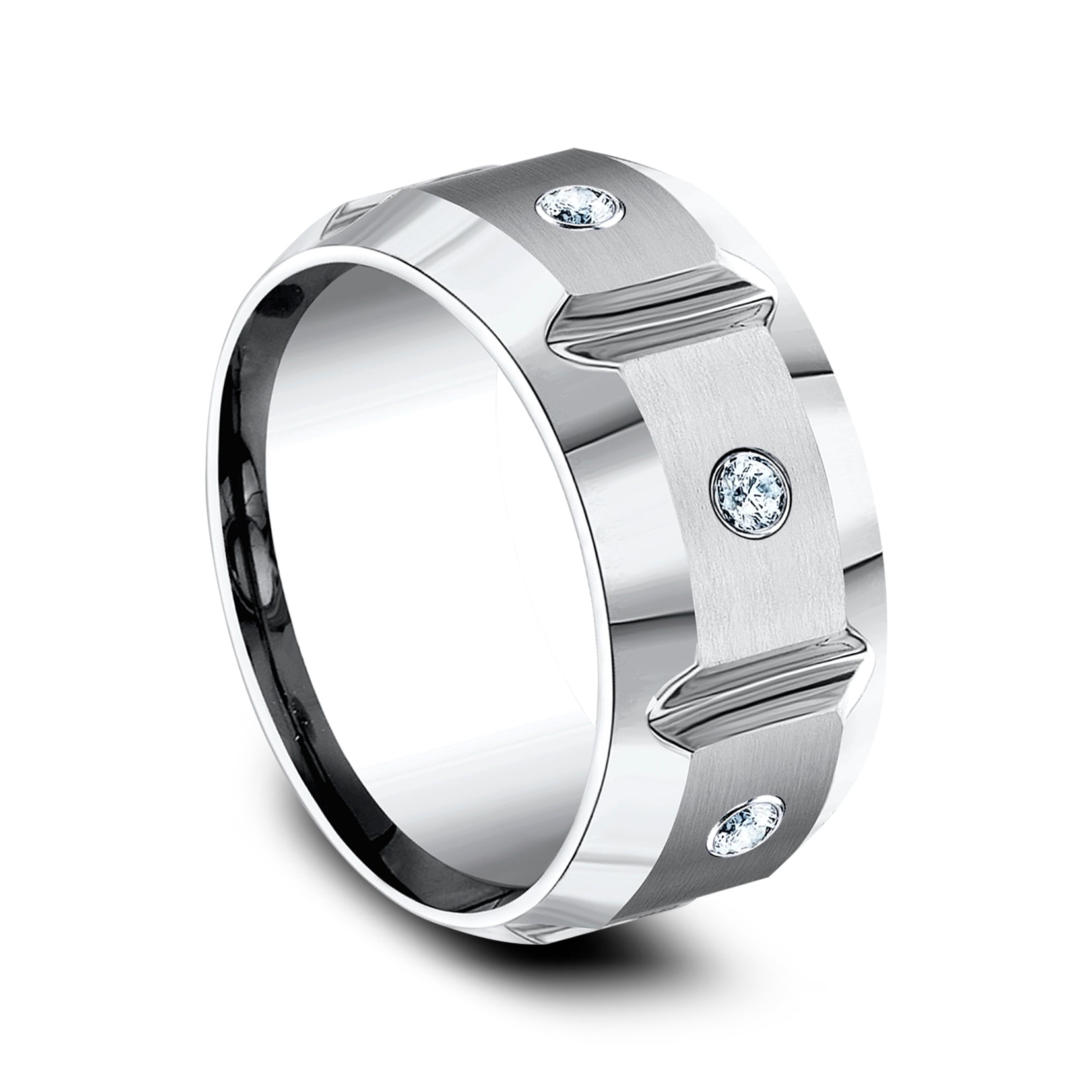10mm, Comfort fit White Cobalt Satin finish with deep segmented cuts 3 burnish set diamonds Carat weight is .18ct Clarity SI1-2, Color GH