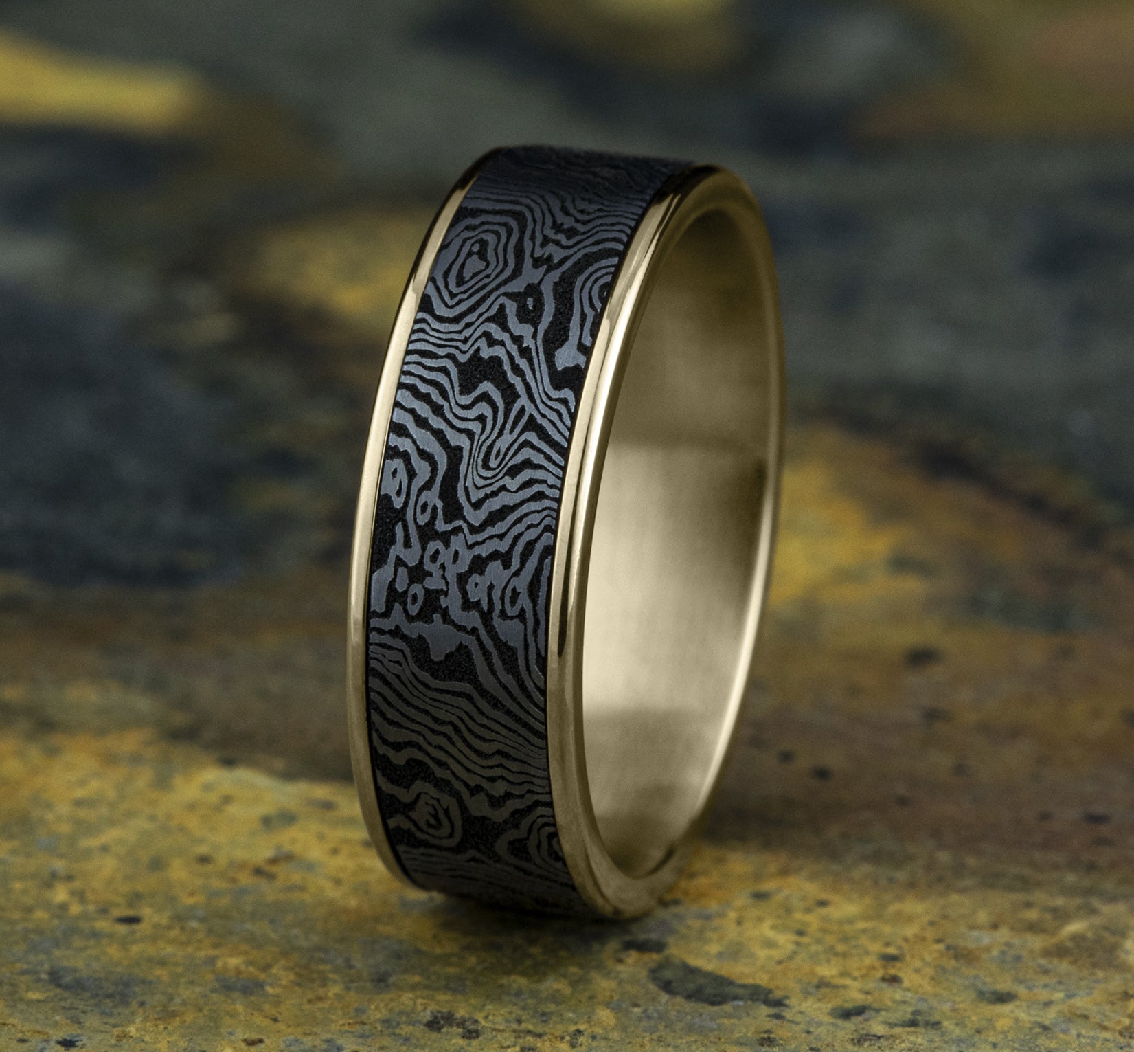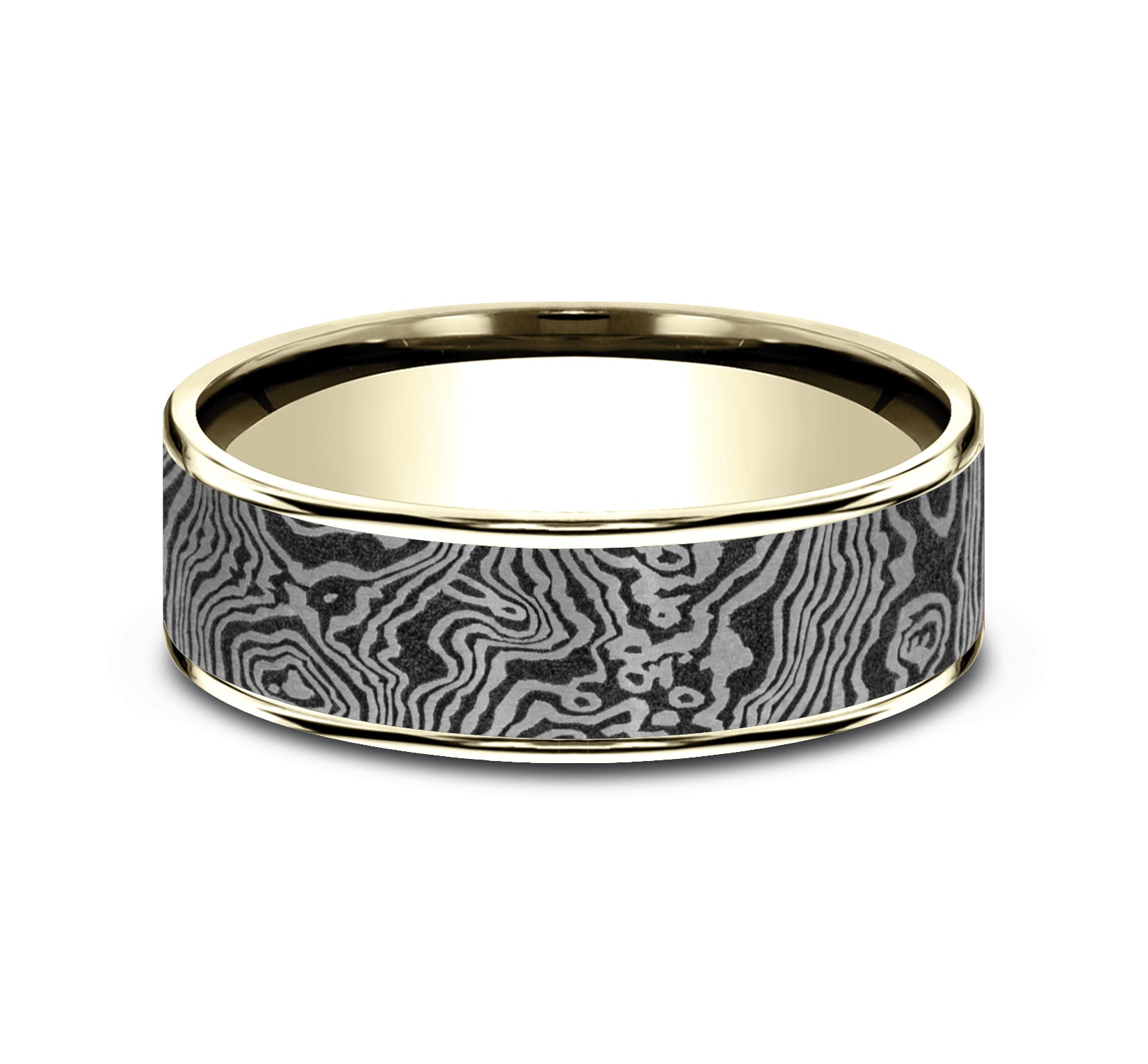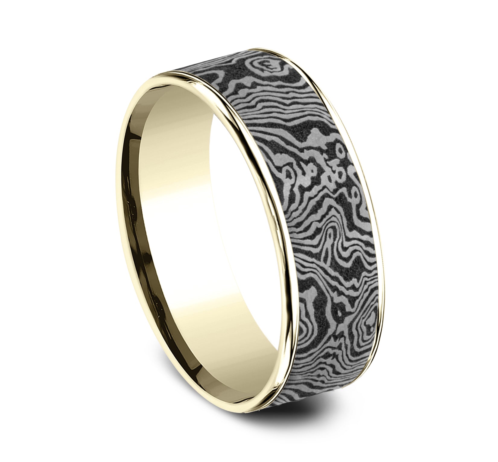 7.5mm, Comfort fit 14K Yellow Gold and Grey Tantalum Unique Tamascus designed center, thin edges