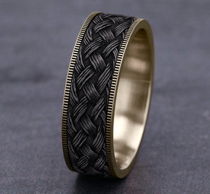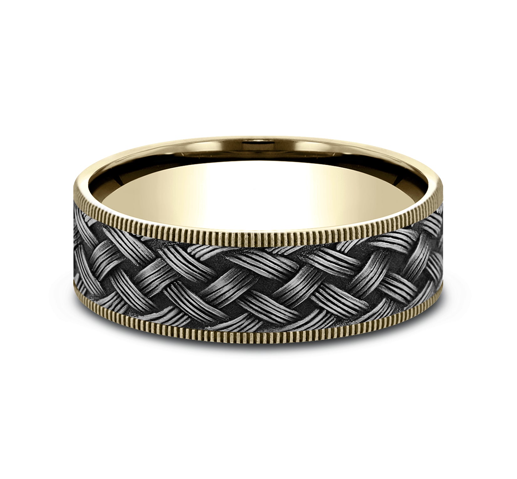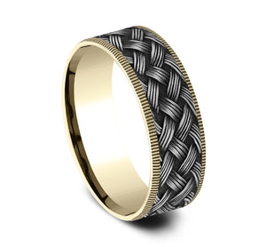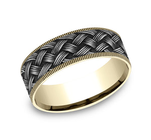 7.5mm, Comfort fit 14K Yellow Gold and Grey Tantalum Lattice weave pattern, thin edges