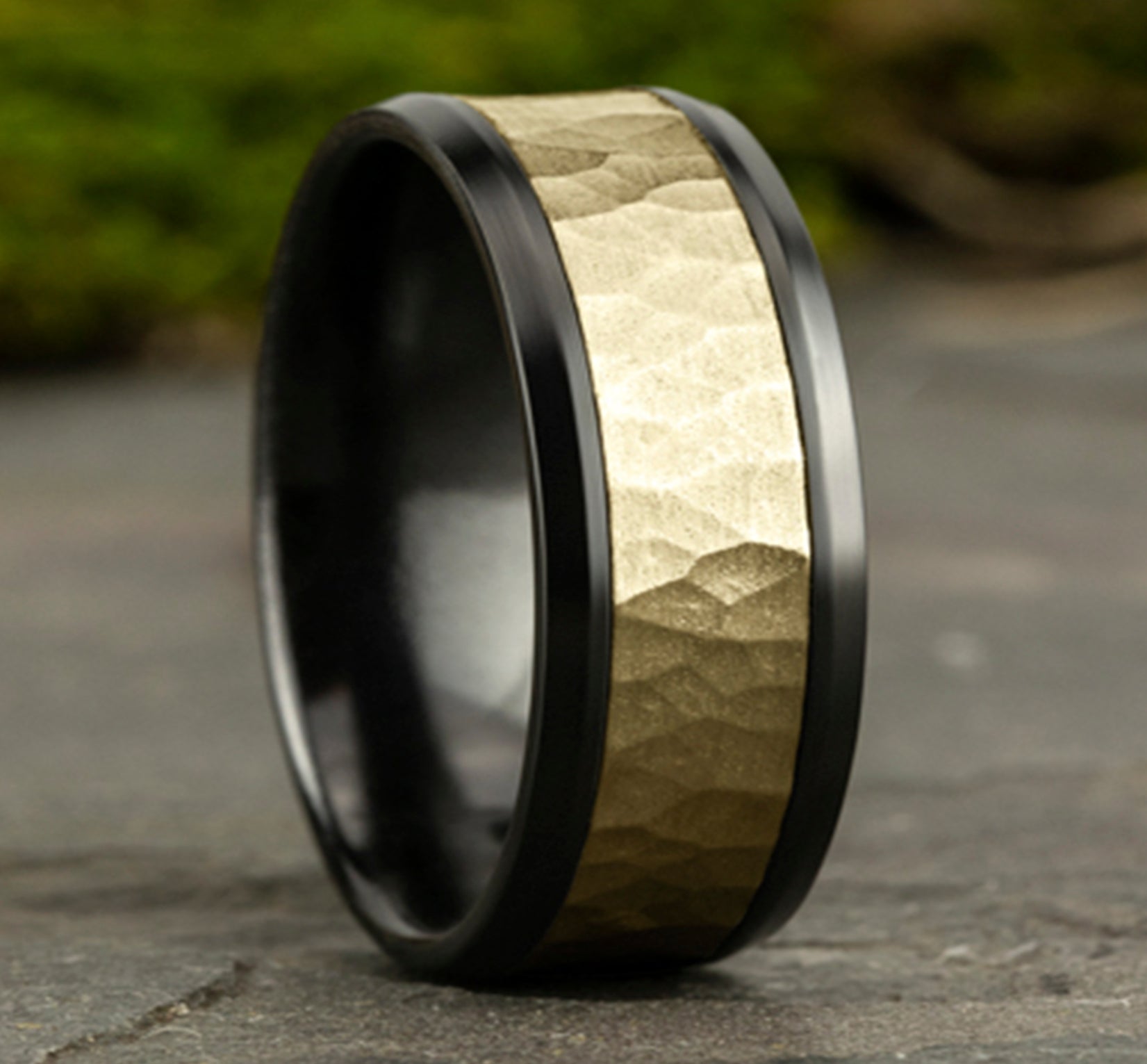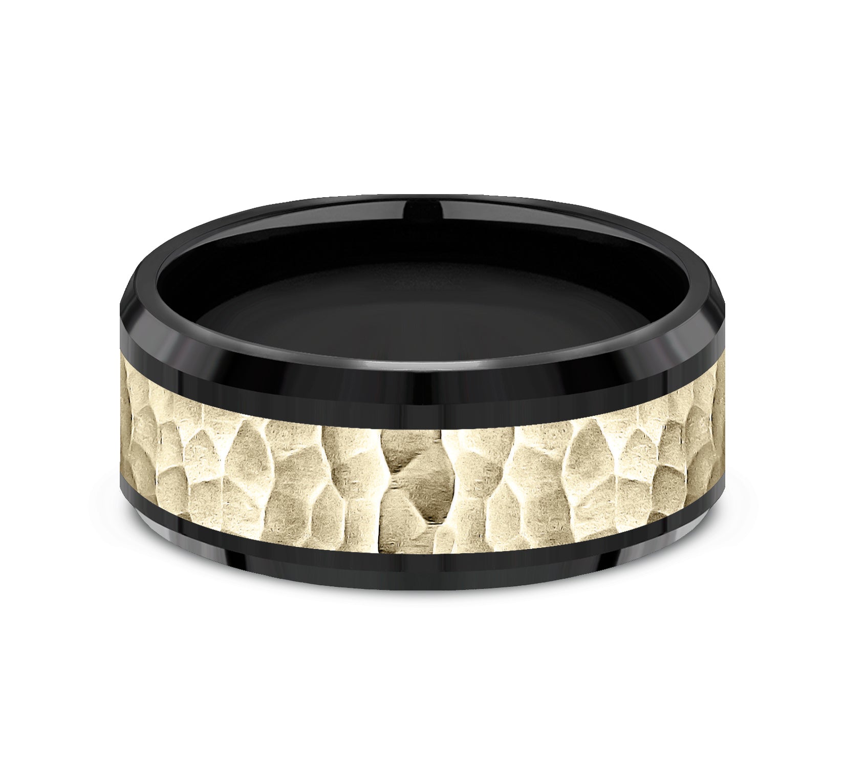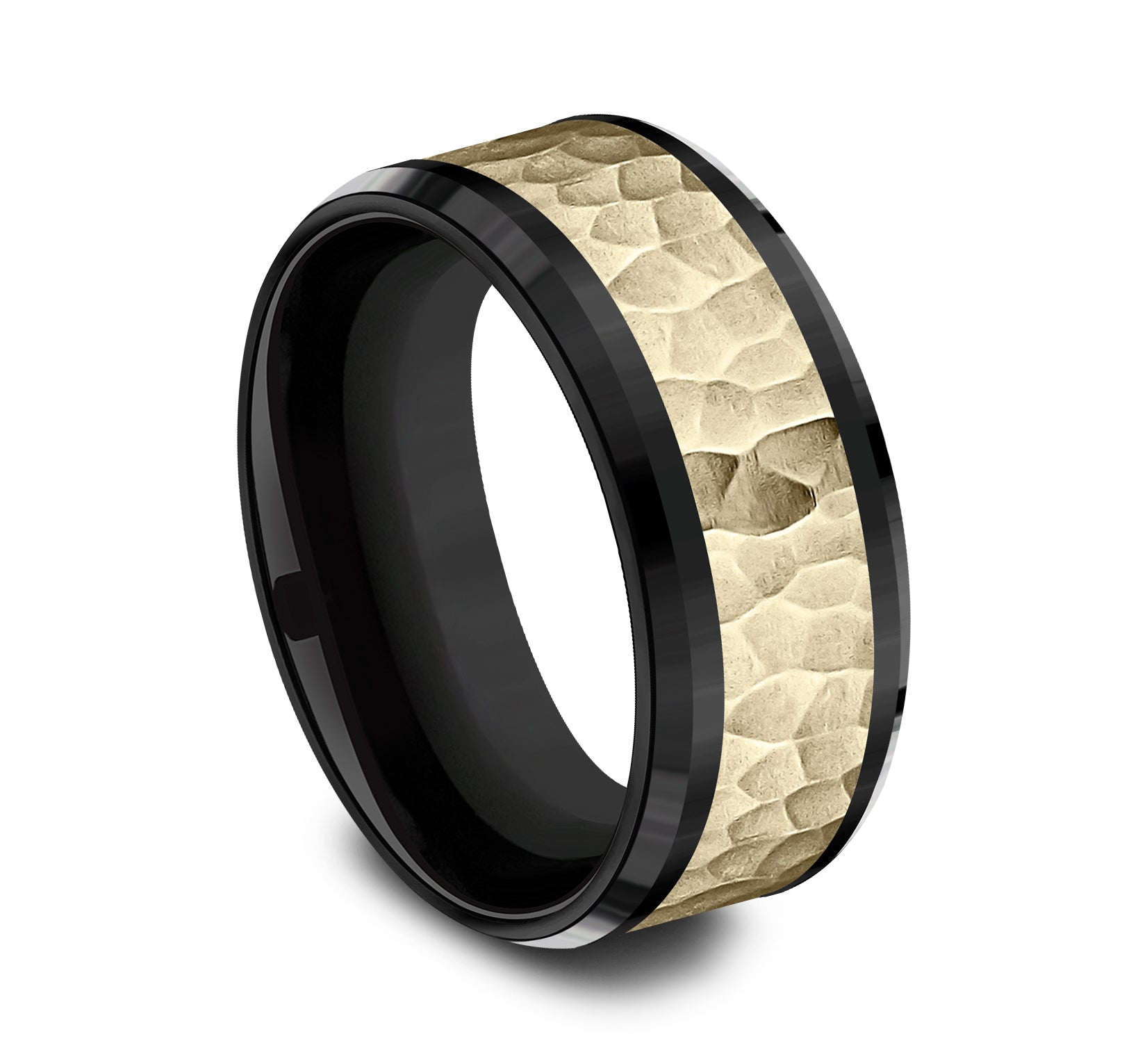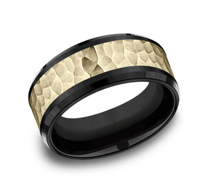 9mm, Comfort fit Black Titanium and 14K Yellow Gold Hammered center, polished bevel edges