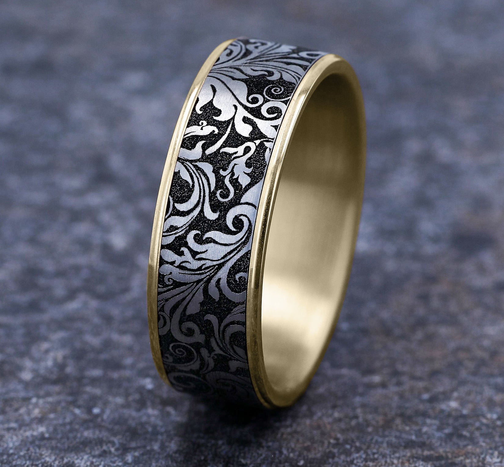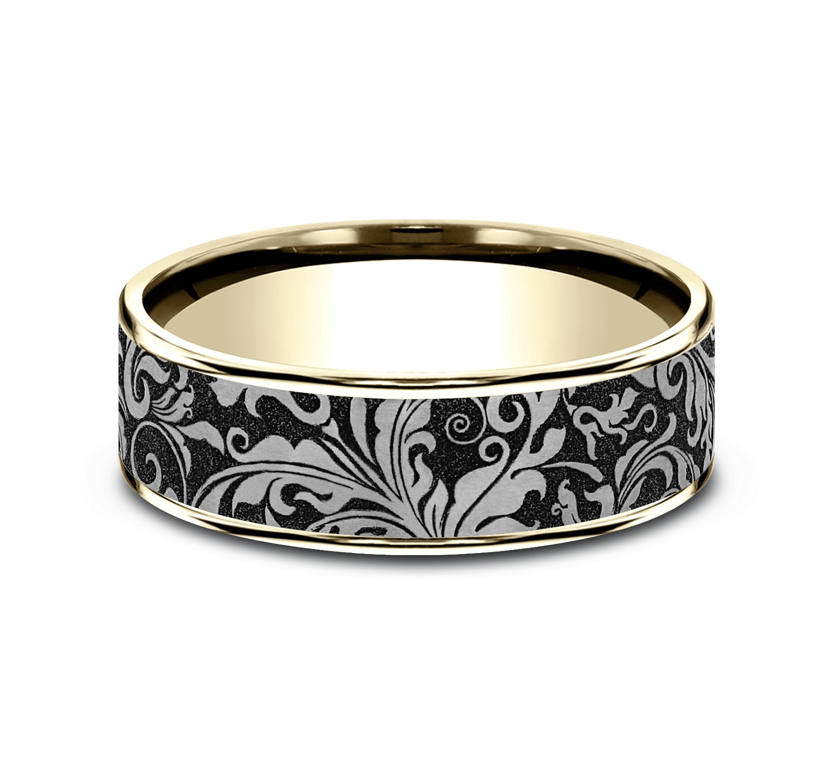 7.5mm, Comfort fit 14K Yellow Gold and Grey/Black Titanium Leaf script pattern, thin edges