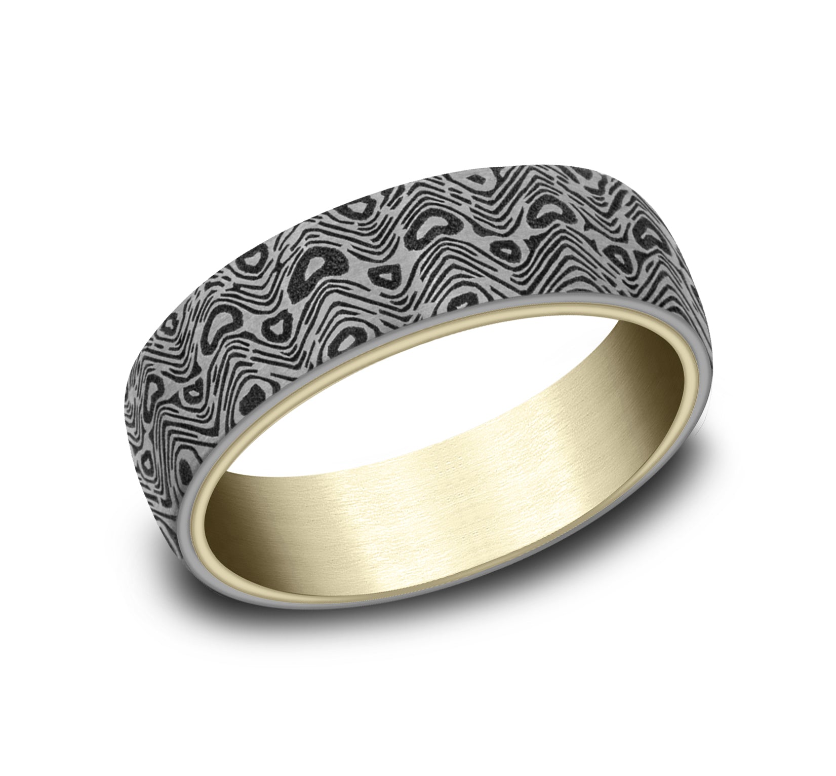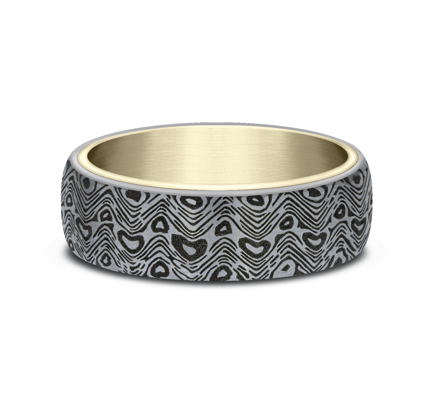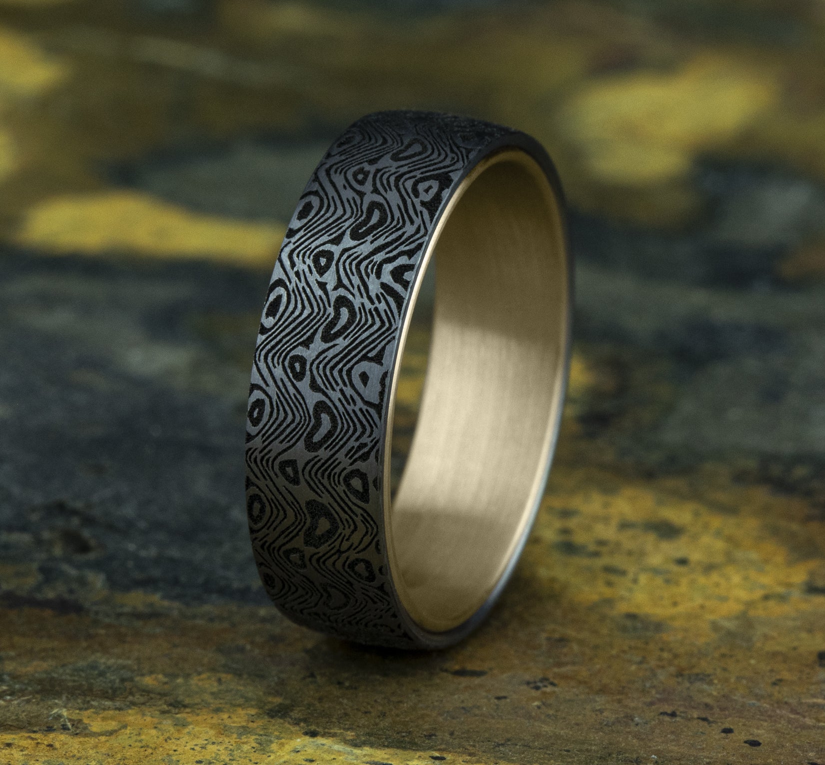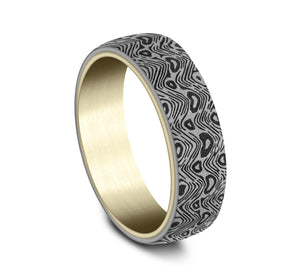 6.5mm, Comfort fit 14K Yellow Gold and Grey Tantalum Unique Tamascus design