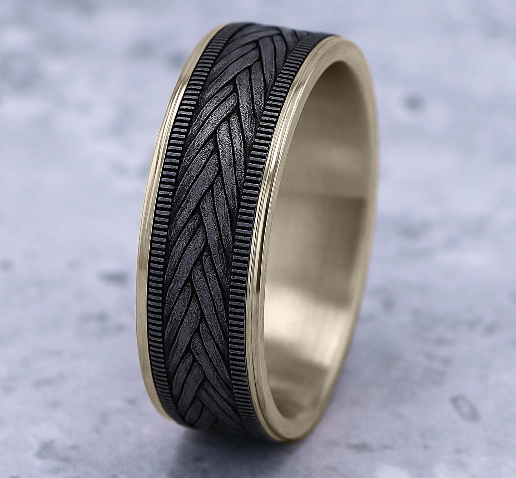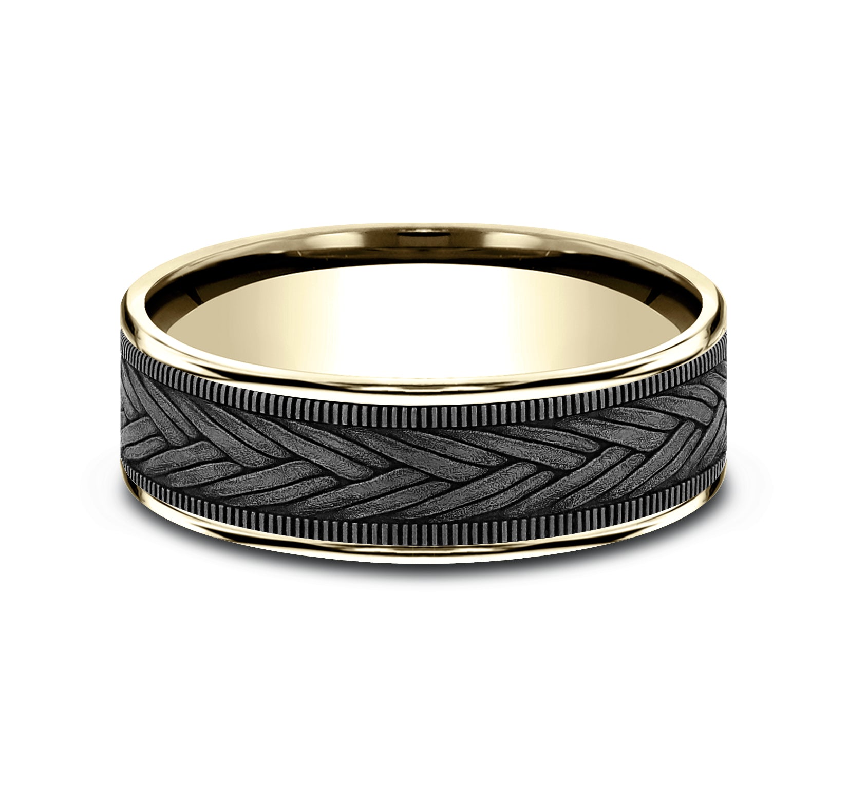 7.5mm, Comfort fit 14K Yellow Gold and Grey Tantalum Wheat weave pattern, thin edges