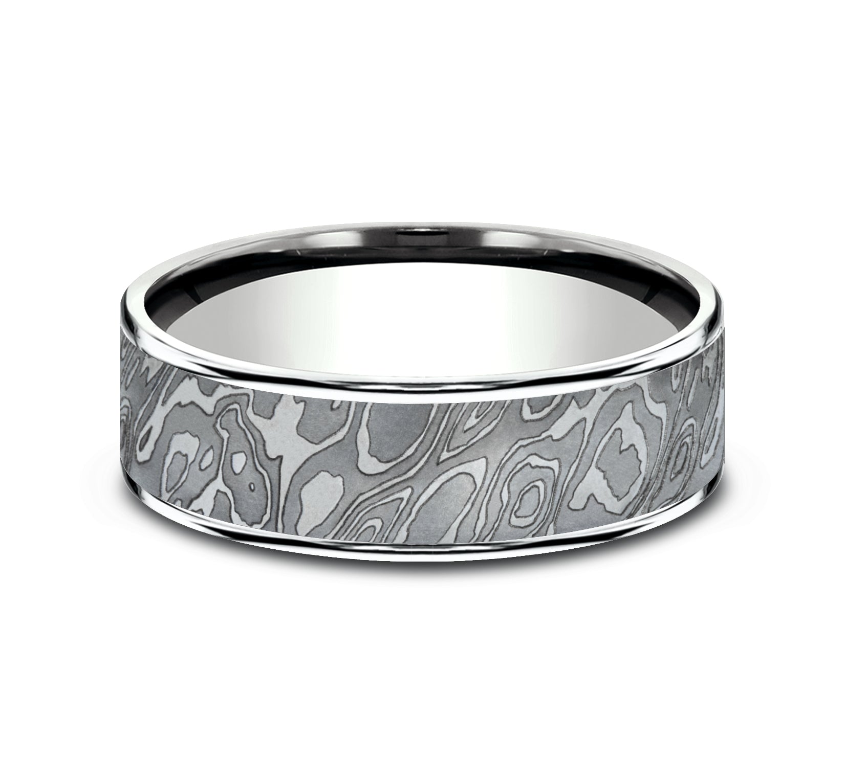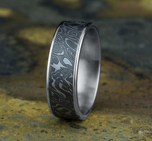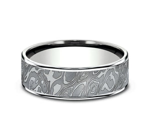 7.5mm, Comfort fit 14K White Gold and Grey Tantalum Unique Tamascus designed center, thin edges